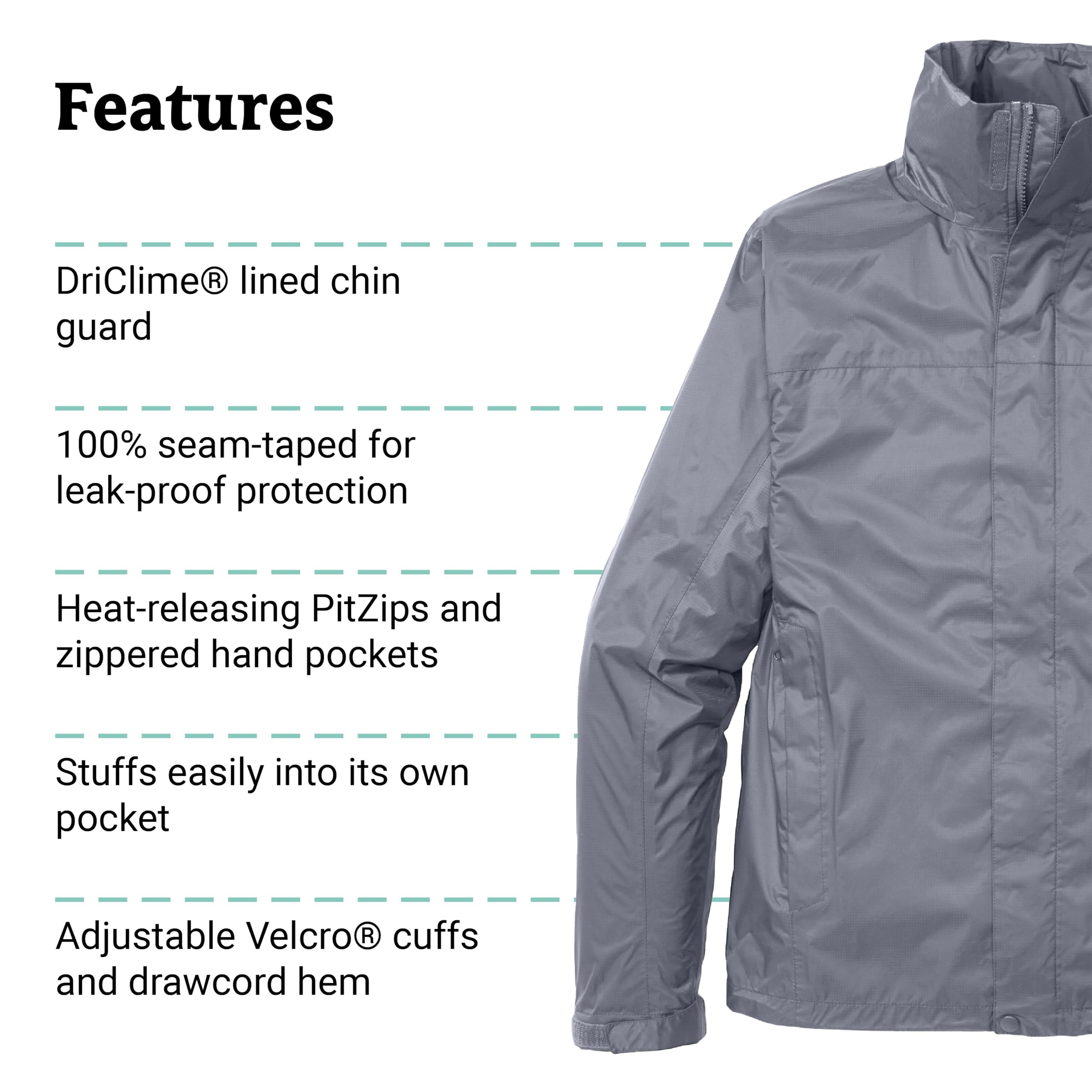 Features pit zips for ventilation to help regulate body temperature, zippered hand pockets for secure storage, easy stowage into its own pocket for convenience, an adjustable drawcord hem and Velcro adjustable cuffs to keep cold air out