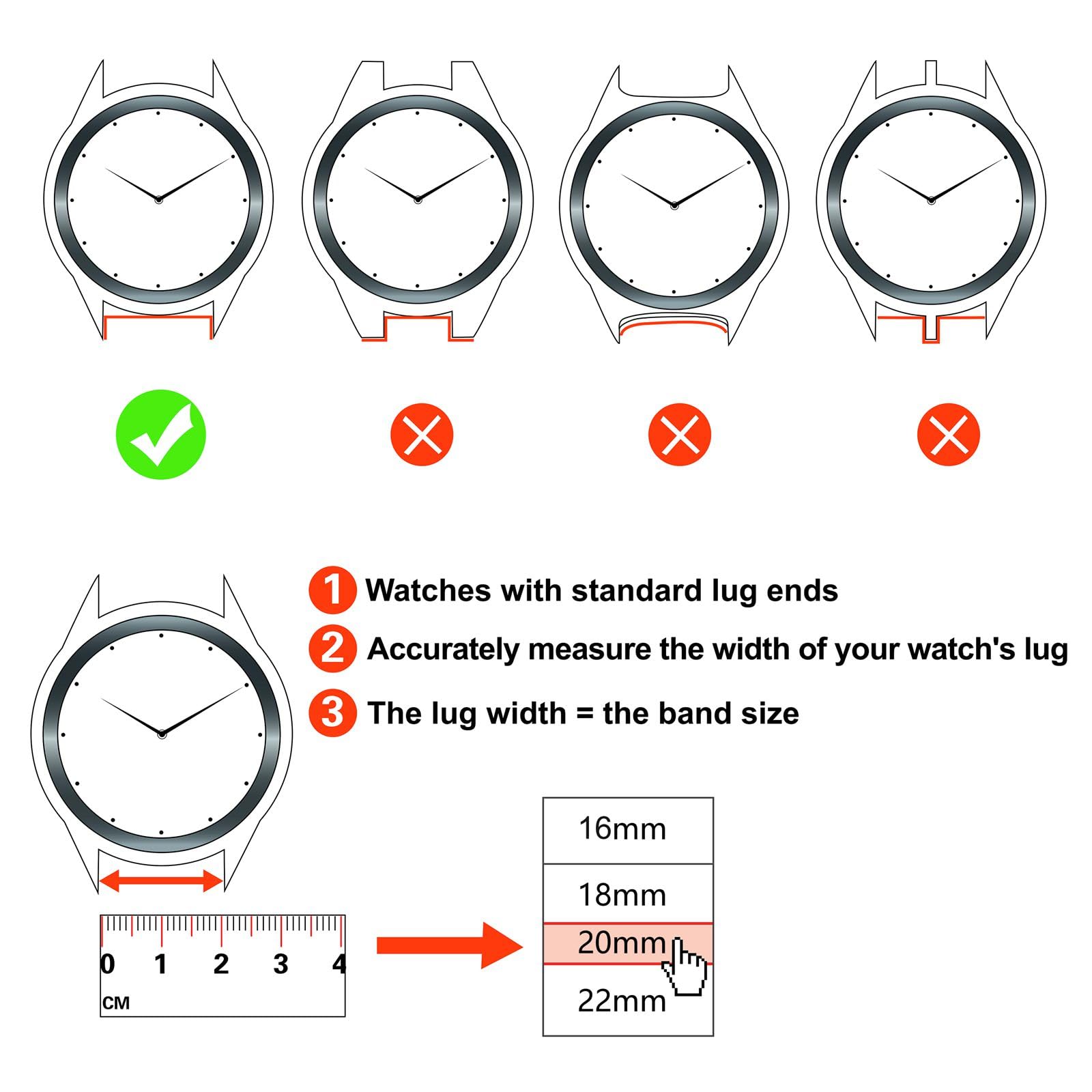 Straps are available in 18mm, 20mm, 22mm widths. To determine the proper width for your watch, use a metric ruler to measure the ‘lug width’ (the point on the watch head where the band attaches)