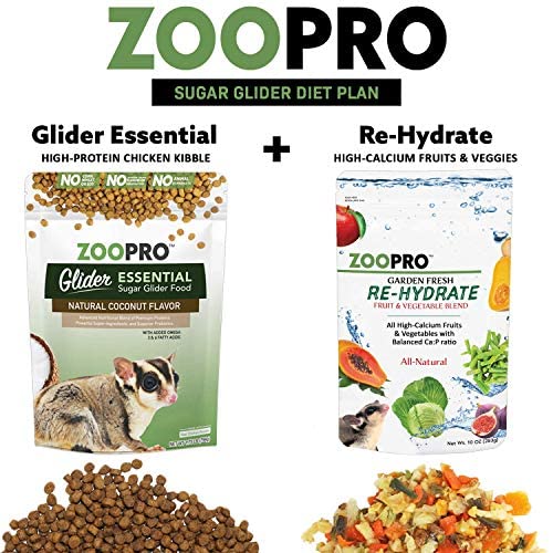 ZooPro's Glider Essential sugar glider food is a highly palatable cooked food with nutrient-rich whole eggs & chicken & the proper vitamin and mineral levels to form a nutritionally balanced food. SIZE: 40 lb. FEATURES: ✔ NUTRITIONALLY BALANCED - Precise formulation designed by a PhD in Animal Nutrition to meet the specific nutritional needs of sugar gliders and guarantee optimal health. ✔ DELICIOUS - Bite-sized kibble is sure to be a hit with even the pickiest suggie, with added natural coconut flavor ✔ MULTIPLE BENEFITS - Crunchy texture benefits both teeth and gums, prevents tooth abscess. Naturally occurring Omega 3 & 6 fatty acids to maintain skin and coat. Added vitamins and minerals. ✔ ZERO FILLERS - No corn, wheat or soy like other sugar glider diets on the market. No animal by-products. 100% natural and made in the USA. Suggested Feeding: Offer free choice along with ZooPro Re-Hydrate (fruits & vegetables). Limit fruits & vegetables to 25% of the diet. Adjust the amount fed to ensure your pet maintains optimum body weight. Always provide multiple sources of bottled water. Guaranteed Analysis: Crude Protein 31.00% (min), Crude Fat 14.00% (min), Crude Fiber 4.00% (max), Moisture 10.00% (max), Calcium (min) 1.55%, Phosphorus (min) 1.06%. Ingredients: Chicken Meal, Brown Rice, Ground Grain Sorghum, Whitefish Meal, Chicken Fat (Preserved), Dried Plain Beet Pulp, Egg Product, Pea Protein, Dried Tomato Pomace, Natural Flavor, Brewers Dried Yeast, Whole Ground Flaxseed, Herring Meal, Menhaden Fish Oil (Preserved), Sunflower Lecithin, Coconut Oil (Preserved), Potassium Chloride, DL-Methionine, Choline Chloride, L-Lysine Taurine, Mixed Tocopherols (Preservative), Vitamin E Supplement, Niacin Supplement, Dried Seaweed Meal [See back of bag for full list of ingredients]