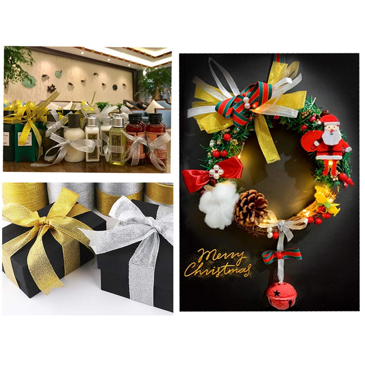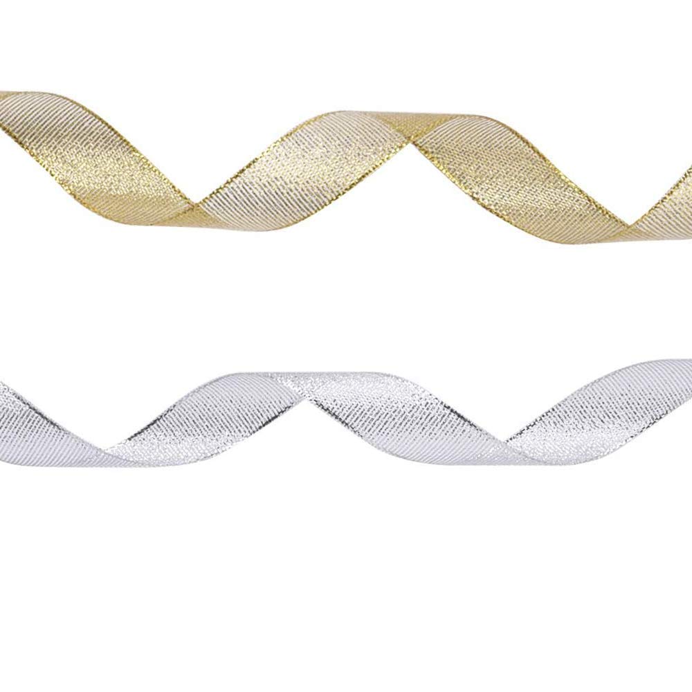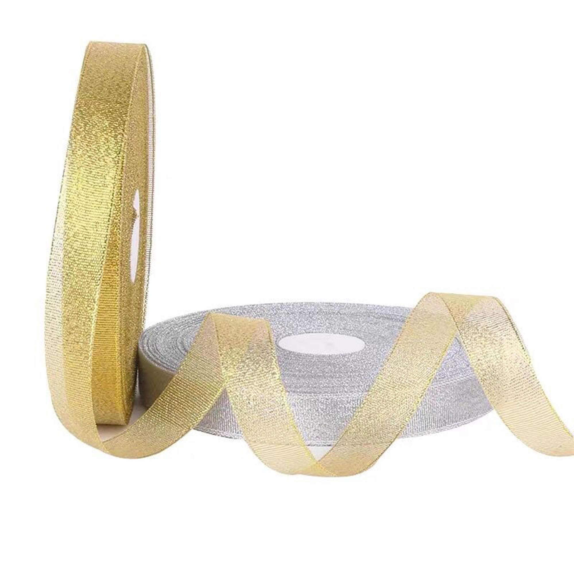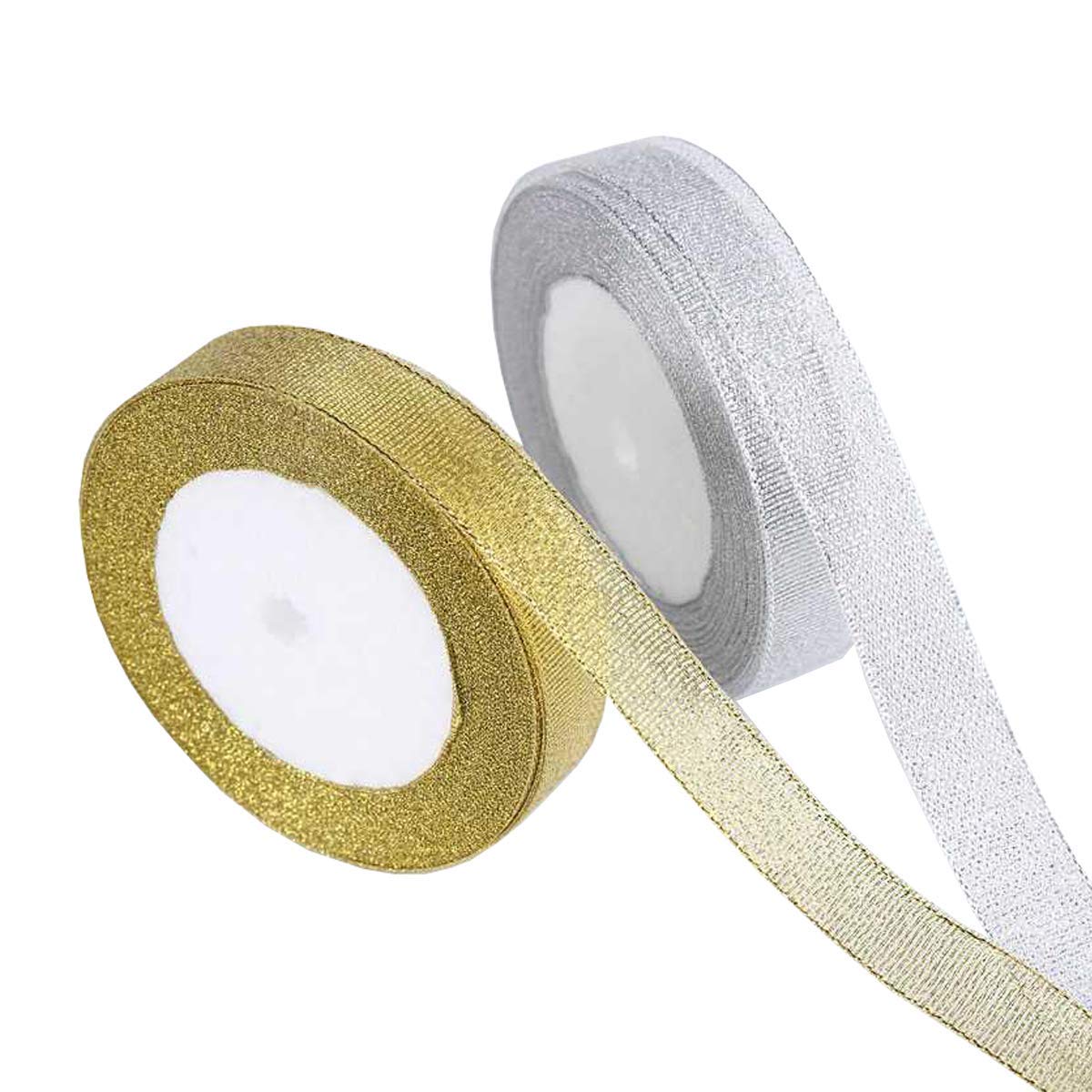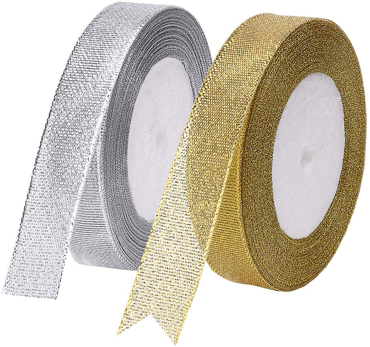 It is including 2 pack organza gold and silver ribbons, 25 yard(22 meters) long per roll, 15mm wide, it's enough for you to finish your craft DIY work or event decoration.