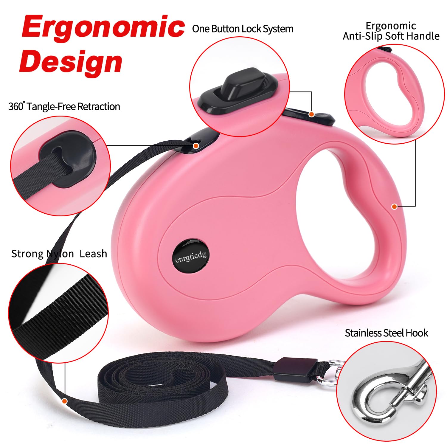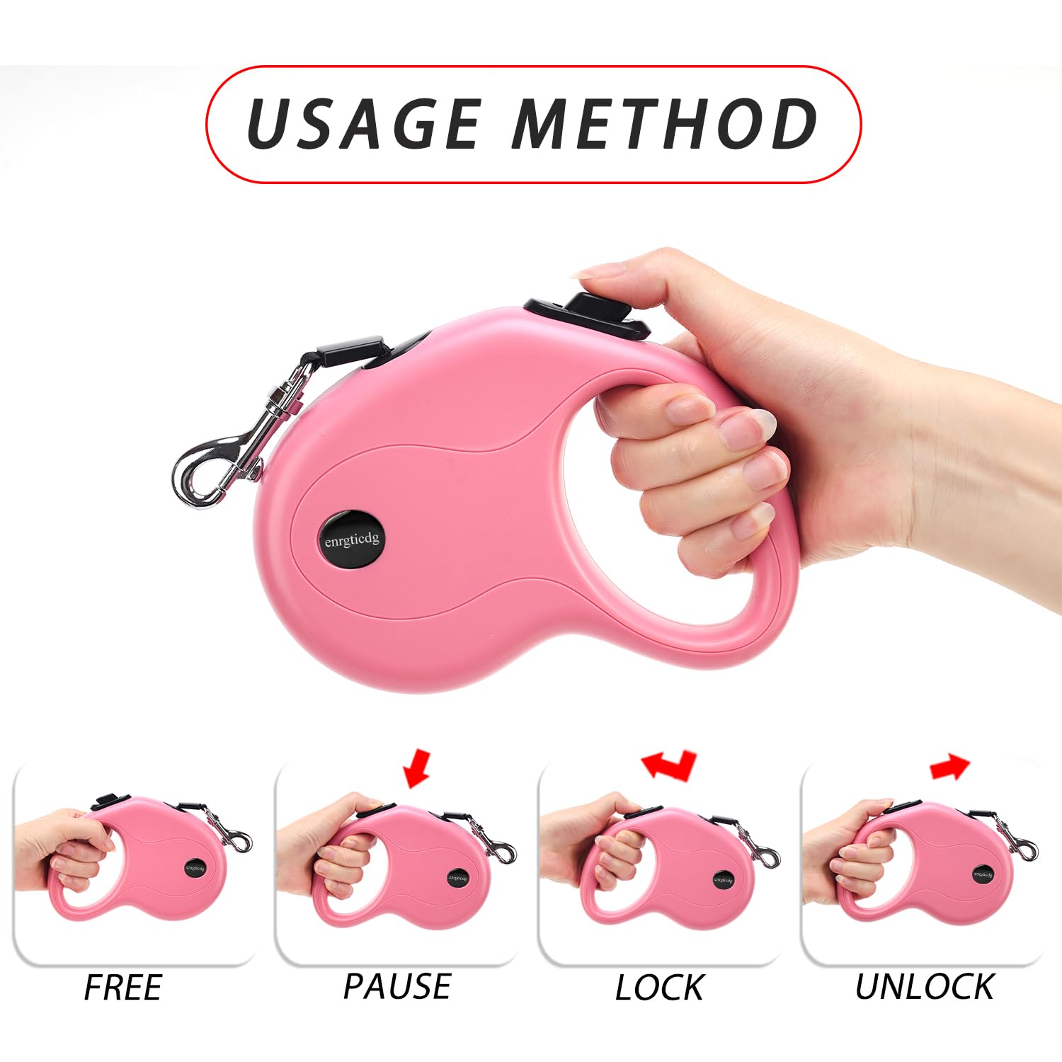 1.enrgticdg has long focused on the high quality of products and customer experience over time . 2.The retractable dog leash adapts corrosion resistant plastic and 16 ft Strong Nylon Tape and scrupulous details disposal, and ergonomic handle grip design fit hands better.3.A reliableQuick lock and unlock featureis flexible to adjust the length of the leash to stay an appropriate length.4.With the powerful upgrade spring and anti-winding rope, the dog leash can be smoothly retracted and released at any angle, giving your pet plenty of room to enjoy free.5.Do not fully release the leash when the dog rush forward, the strong impact will damage the spring and internal accessories.It needs to be locked in time.