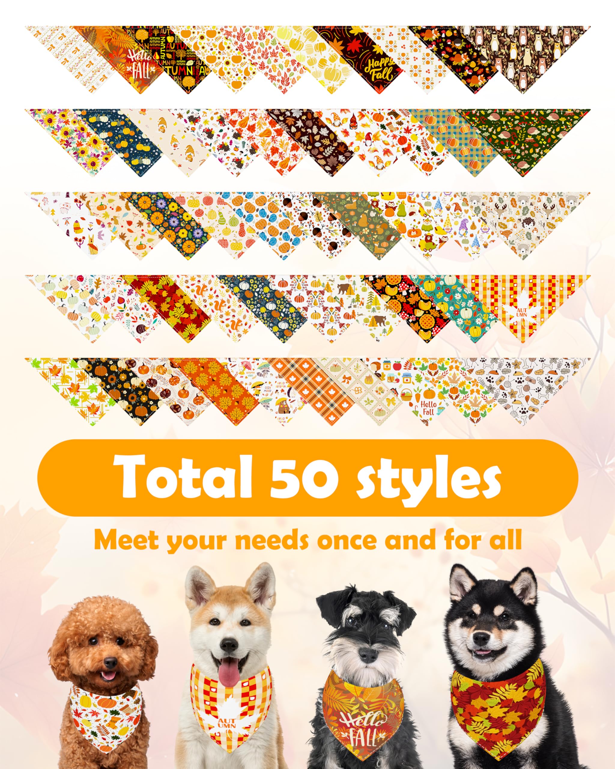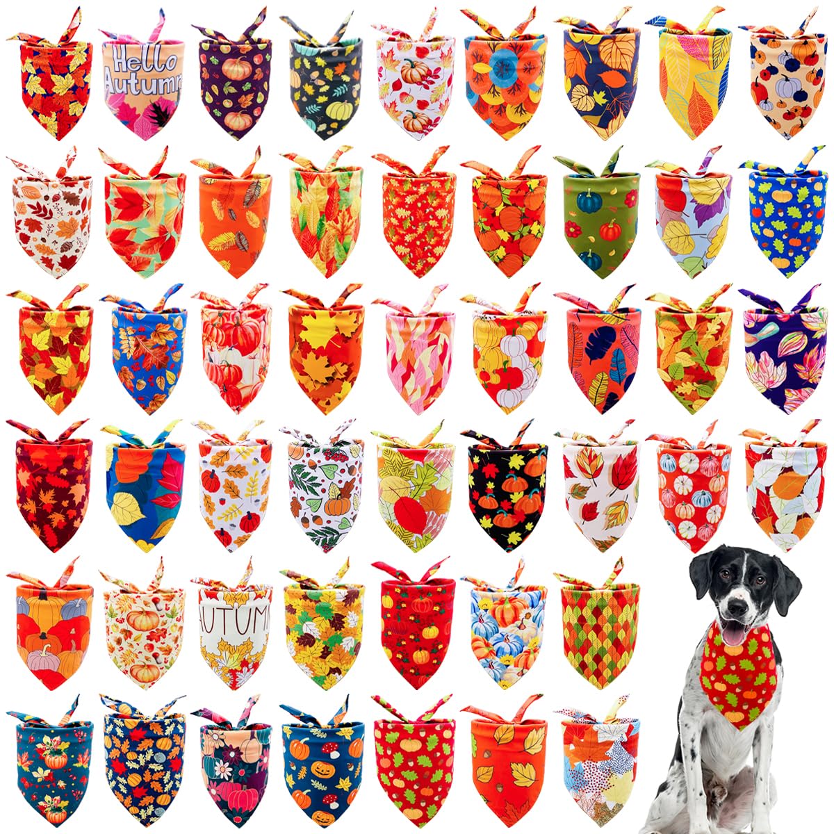 Fall Design: The package includes 50 pieces/pcs triangle dog bandanas in total with 50 different autumn theme patterns include pumpkin, maple leaves, pinecone, mushroom, bear, sunflowers, ginkgo leaves, hedgehogs, plaid, foxes etc. Colors include yellow, orange, black, brown, green, blue and red. Colorful fall patterns will make your doggies get many compliments, they are full of autumn atomosphere and will add a lot of charm to your pets