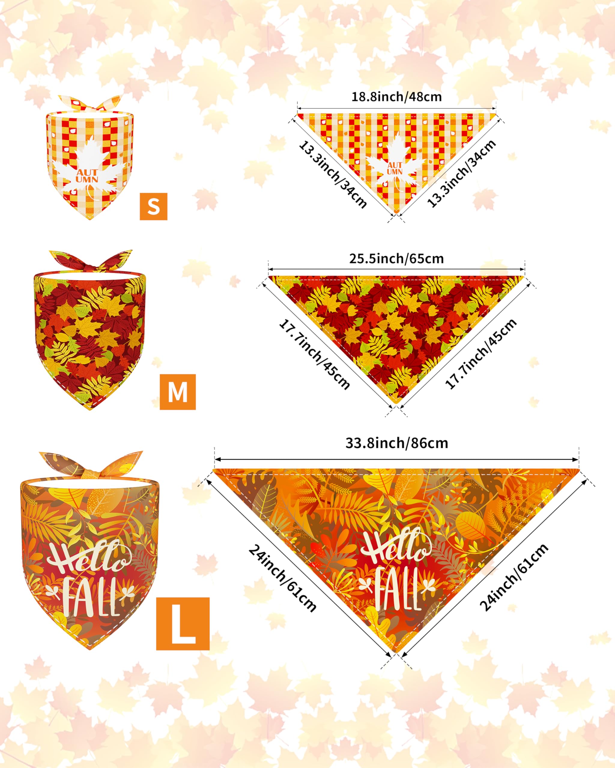 Size: The fall puppy bandana is about 18.9x13.4x13.4 inch, suitable for most small medium dogs and cats. They can be folded multiple times to fit the size of small pets, please carefully measure your pet's neck circumference before purchasing and leave room to tie knot