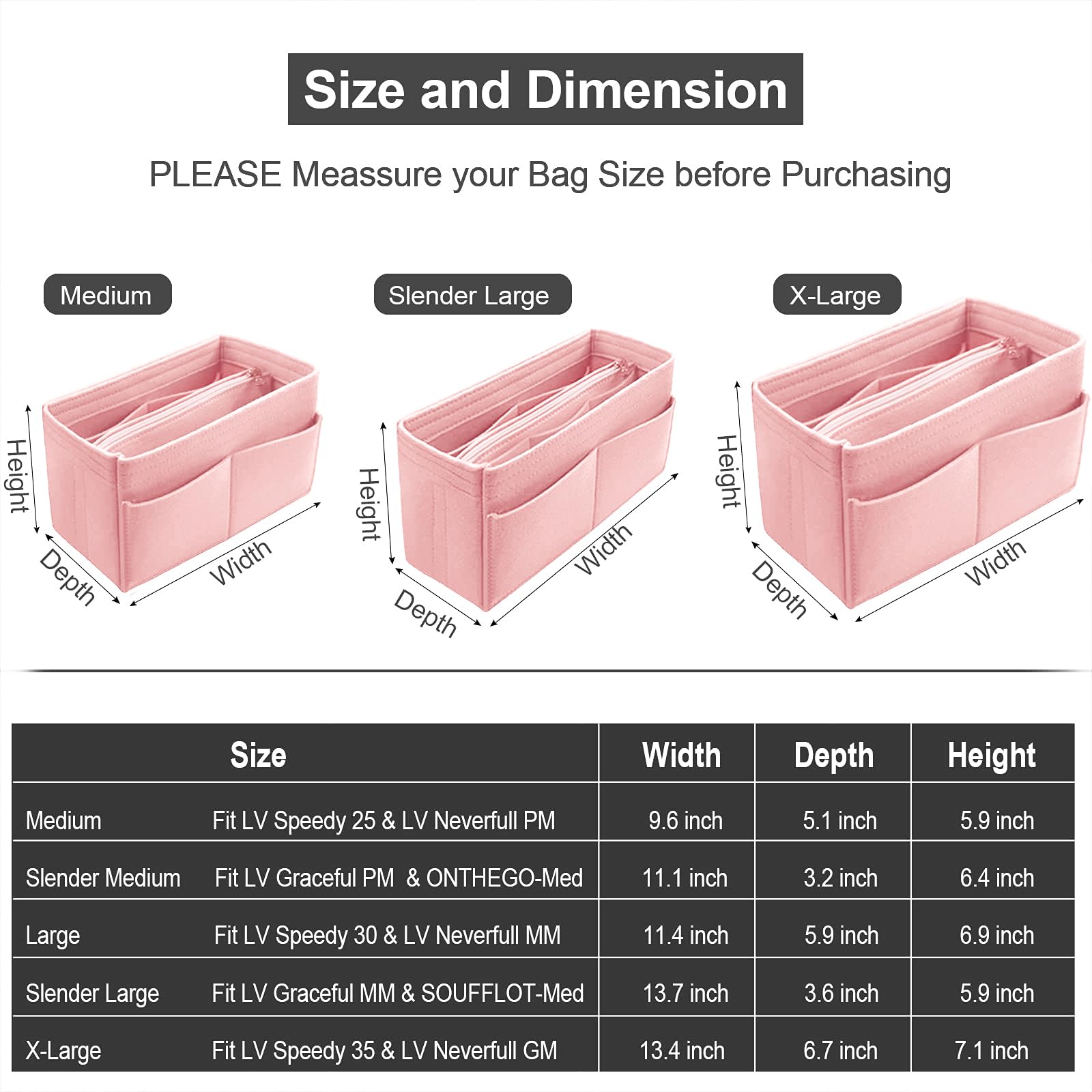 5 Size Options: Our bag insert comes in 5 sizes, compatible with Neverfull, Longchamp Le Pliage Tote, Speedy, Goyard, MK, Coach, Katespade, etc. Medium: 9.6" x 5.1" x 5.9" Slender Medium: 11.1" x 3.2" x 6.4" Large: 11.4" x 5.9" x 6.9" Slender Large: 13.7" x 3.6" x 5.9" X-Large: 13.4" x 6.7" x 7.1" NOTE: Ideal fit means within 1.5", loose fit means within 2.5"