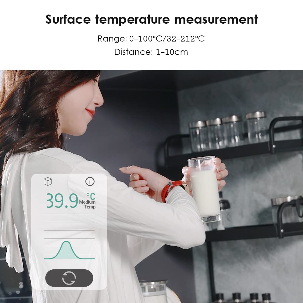 Temperature test&Health Monitoring: Non-contact design provides a safe and hygienic experience with little risk of cross-contamination. The thermometer will produce results with a reading distance of 2-5 inches from the target surface. temperature(Body&Surface), SpO2(this is not a medical device and is not intended for use in the diagnosis or monitoring of any medical condition), respiration, stress, sleep, heart rate, humidity, and more
