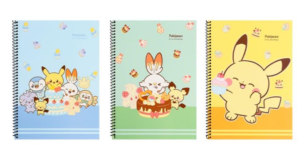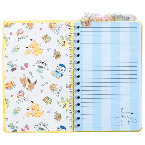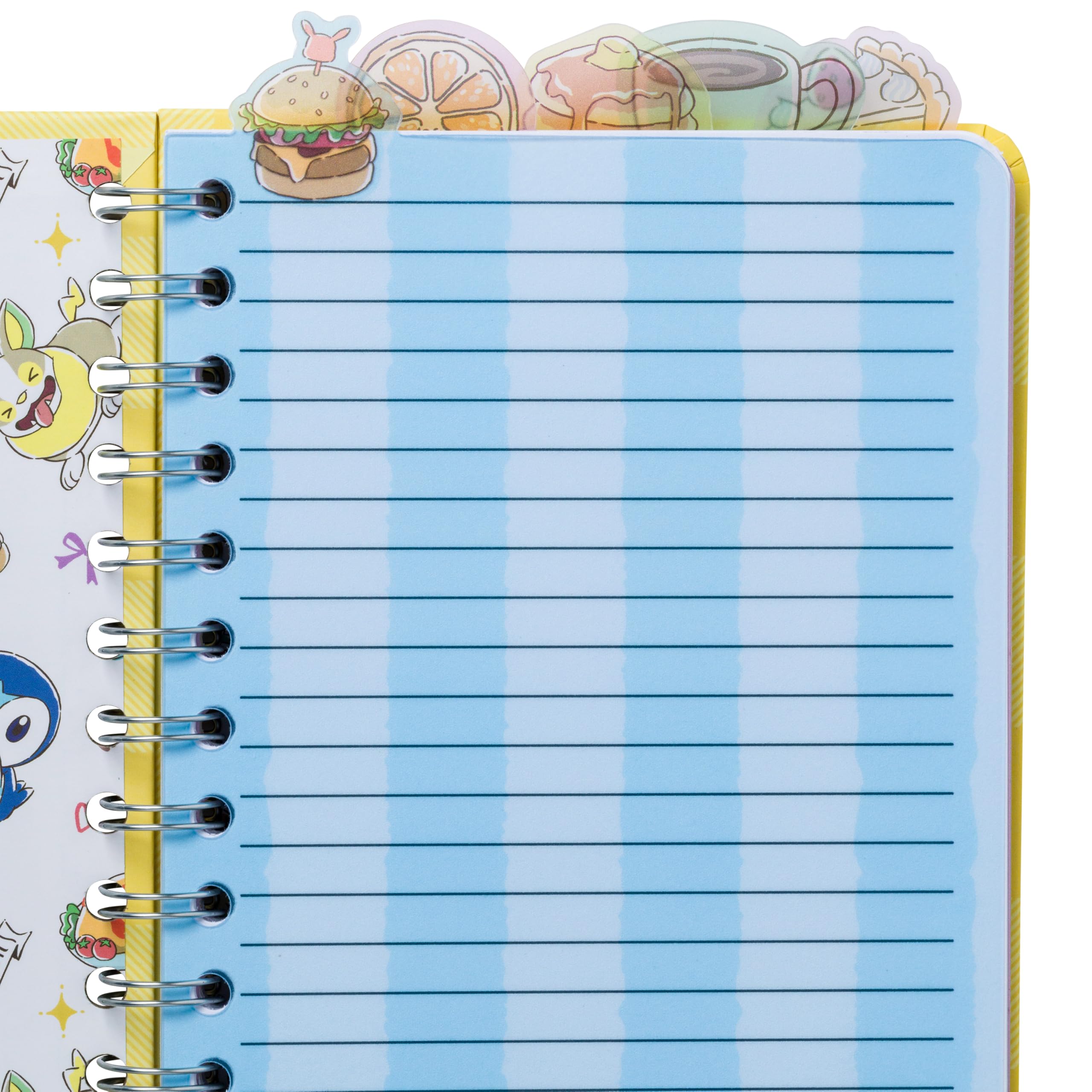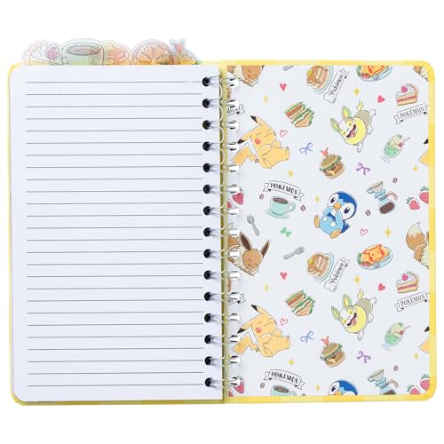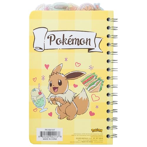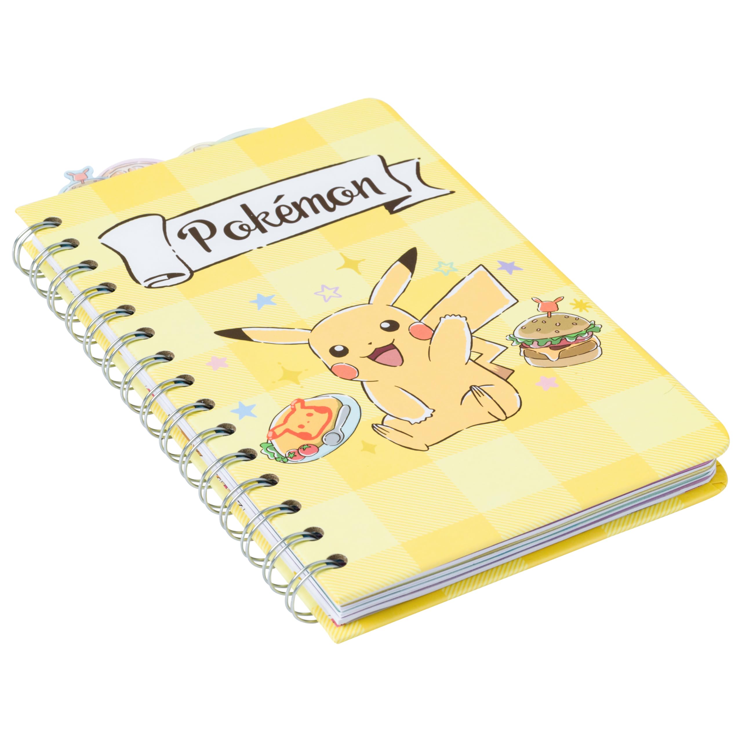 POKEMON NOTEBOOK: This spiral notebook has a yellow checkered cover. Front cover design showcases Pokemon posed among cute food items waving. Back cover features Eevee adorably placed near a milkshake and sandwiches. Spiral notebook comes with food themed tabs to help you stay organized.