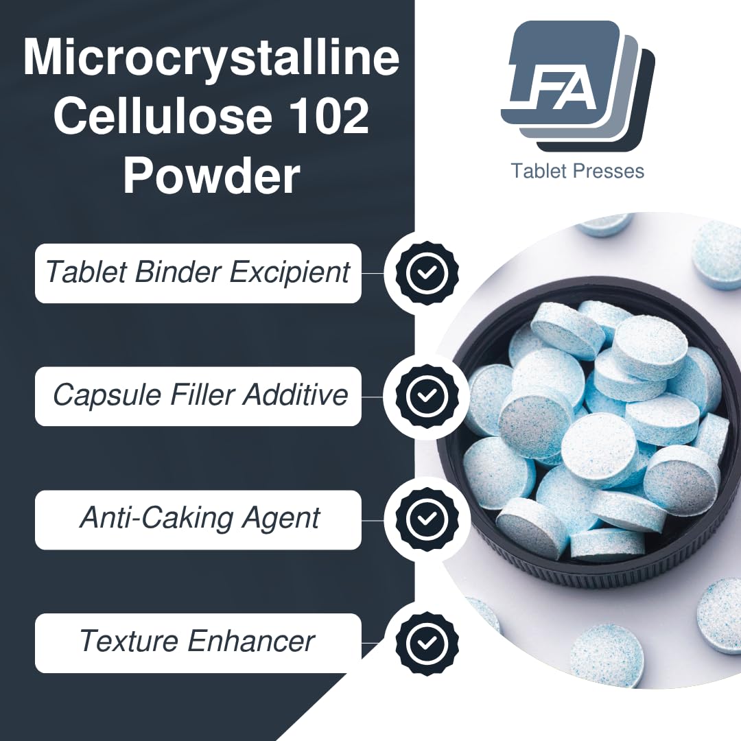 Solve Tablet Uniformity Issues: Minimal bulk density of 0.4g/cm3 and average particle size of 100 microns. MCC 102 features a large particle size distribution to enhance flowability and compressibility. Ensure uniform weights in capsule filling, dry granulation, and direct compression tablet production.