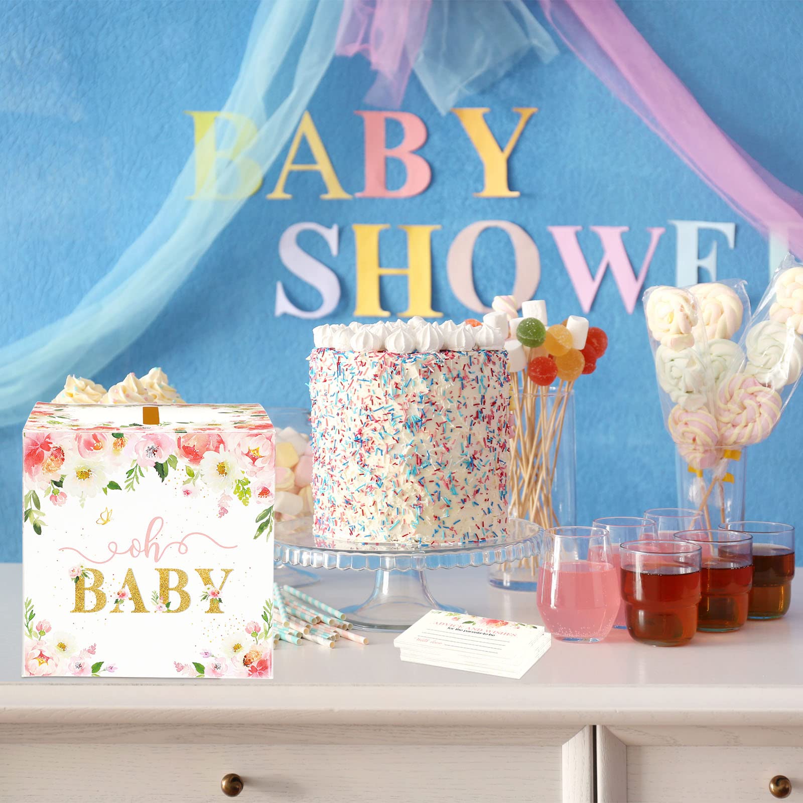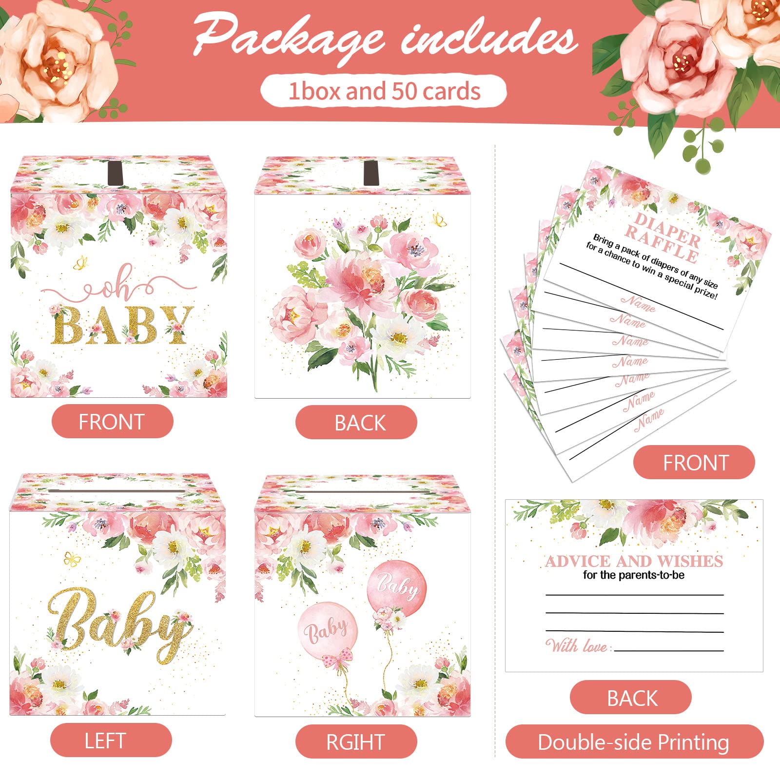 Reliable Workmanship for Exquisite Appearances: made of hard cardstock, the card box for baby shower is sturdy, thick and serviceable, hardly deforming or breaking; The floral cards are also made of cardboard, clearly printed with beautiful words and patterns, not easy to fade