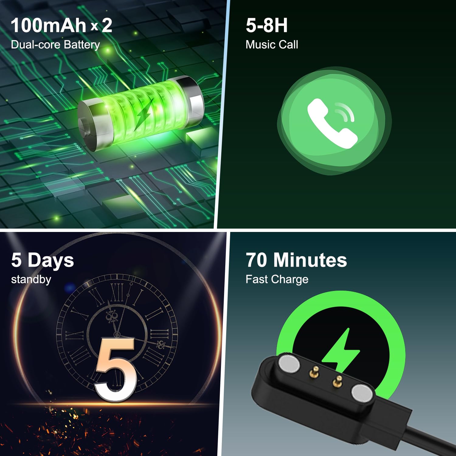 【Long Battery Life】These bluetooth 5.3 glasses for men women come with dual 100mAh batteries provide 5+ hours of playtime, 5-hour calls, or 5 days standby, fully charged in 70 minutes , perfect for travel, workouts, or daily commutes.