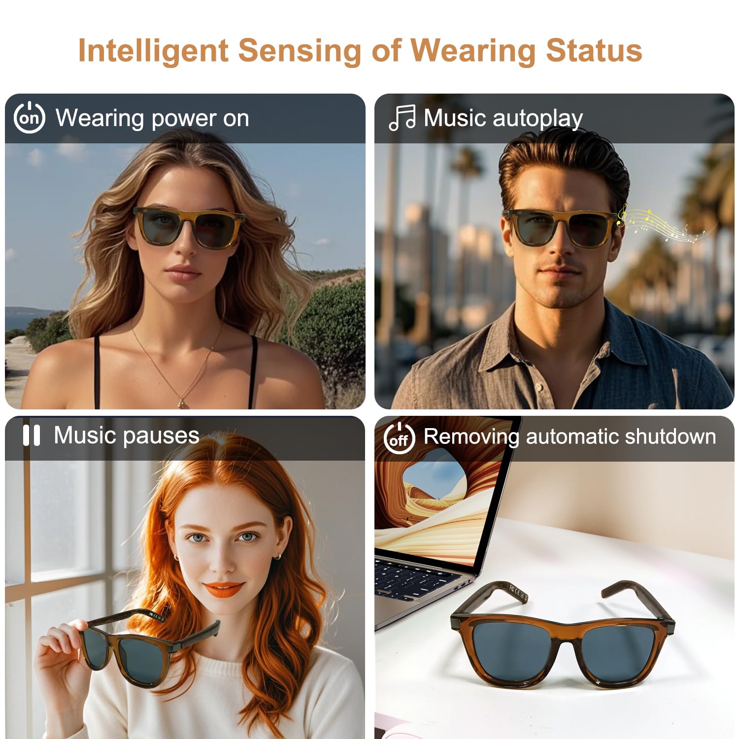 【Auto On/Off by Wearing Sensor】Intelligent identification, dynamic tracking of glasses wearing status. Automatically switch on when you wear the smart glasses, and switch off when you take them off, energy saving and environmental protection and save your time.