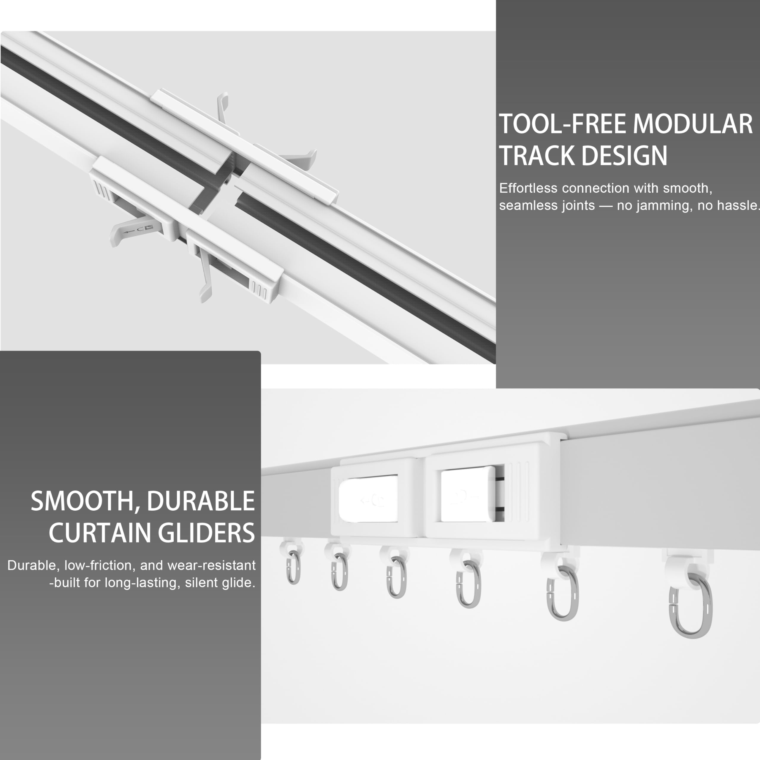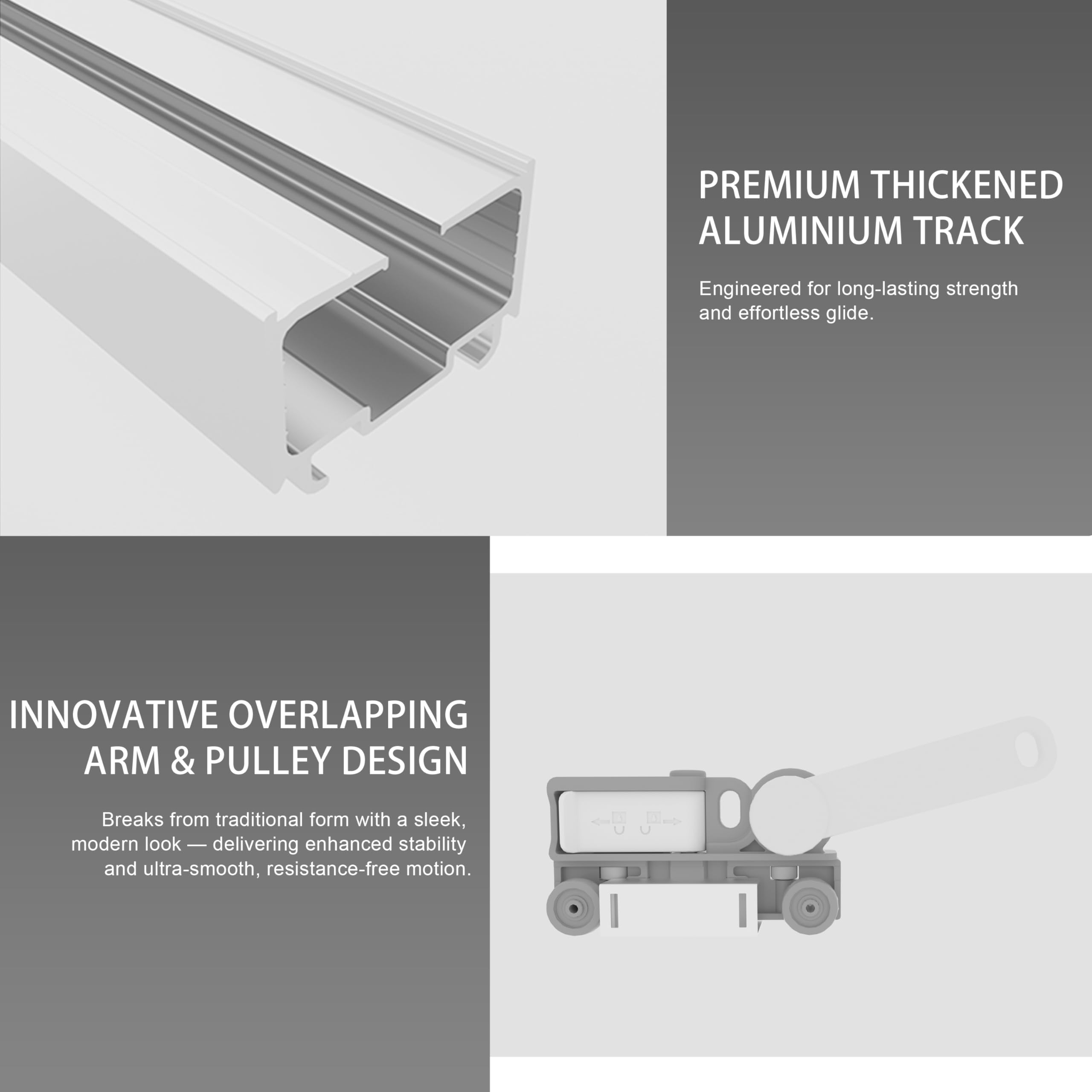 【Revolutionary Beltless Adjustable Track System】 Effortlessly extend up to 7 meters (275 inches) or shorten to any size with no tools required. Achieve a seamless, custom fit by adding or removing track sections for ultimate flexibility.
