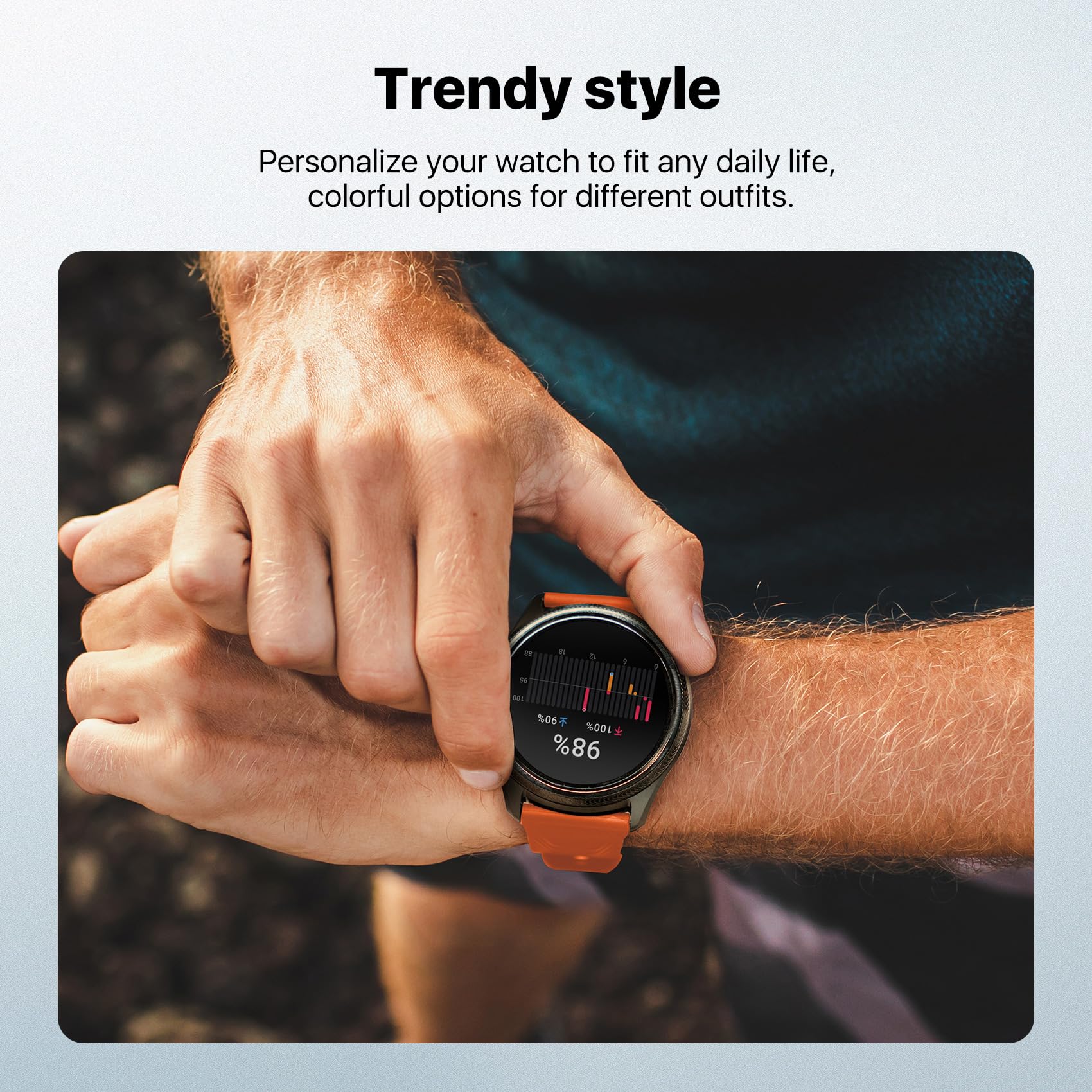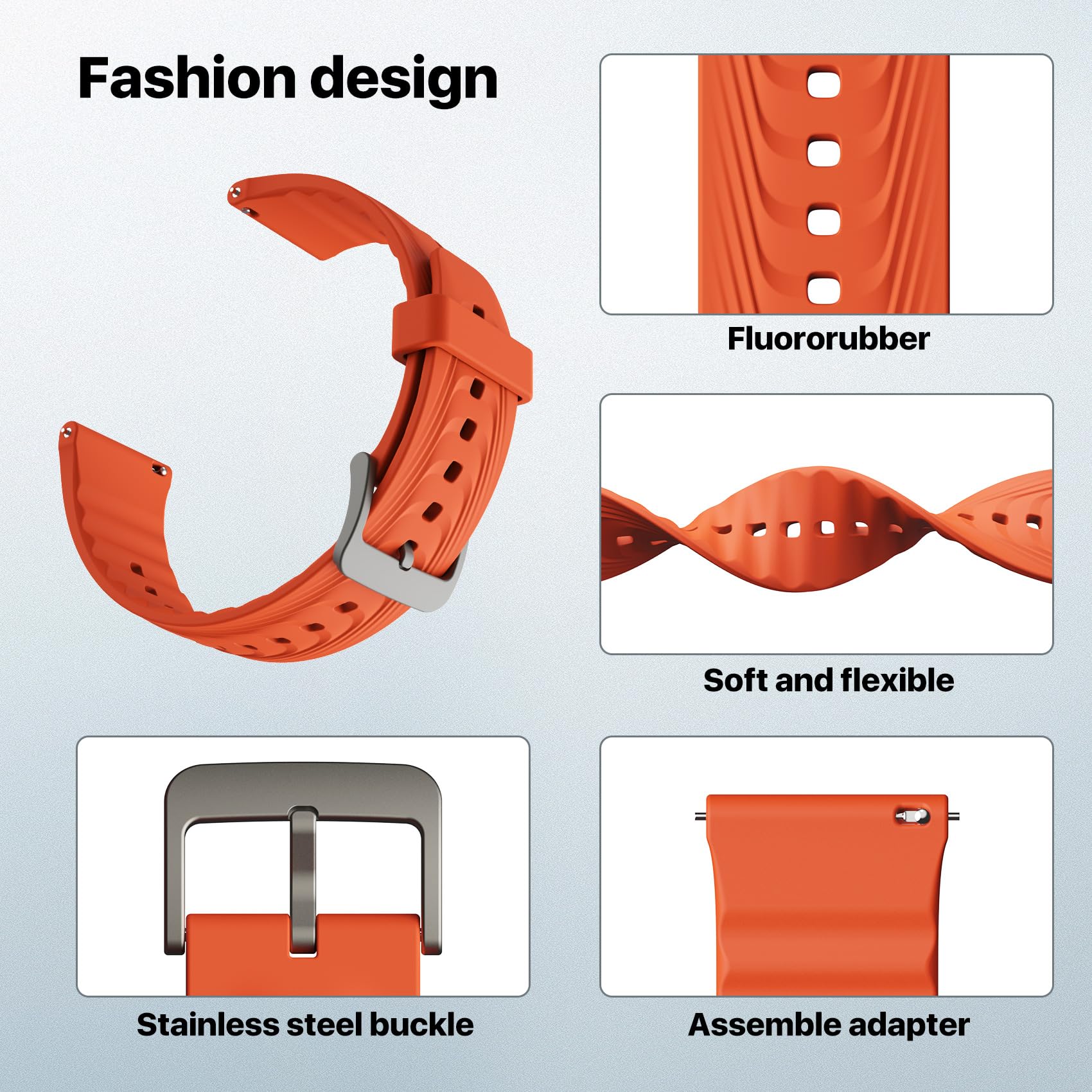 【Material】The watch strap material is made of Eco-friendly silicone + Stainless steel buckle. The surface of strap is smooth, soft and durable, not easily deformed, light and sweat-proof, and it feels very comfortable to stick on the skin. Lightweight and waterproof. Easy to clean.