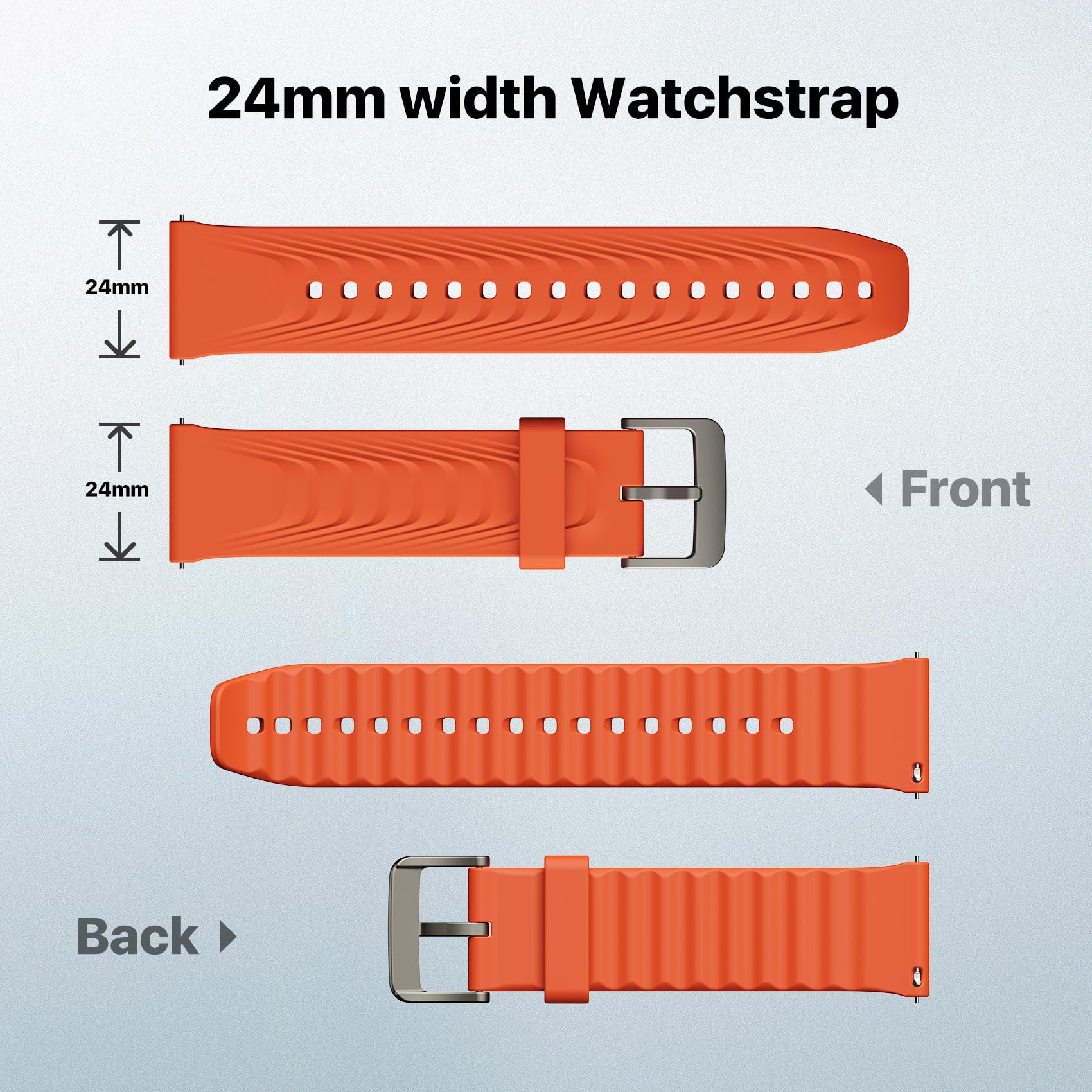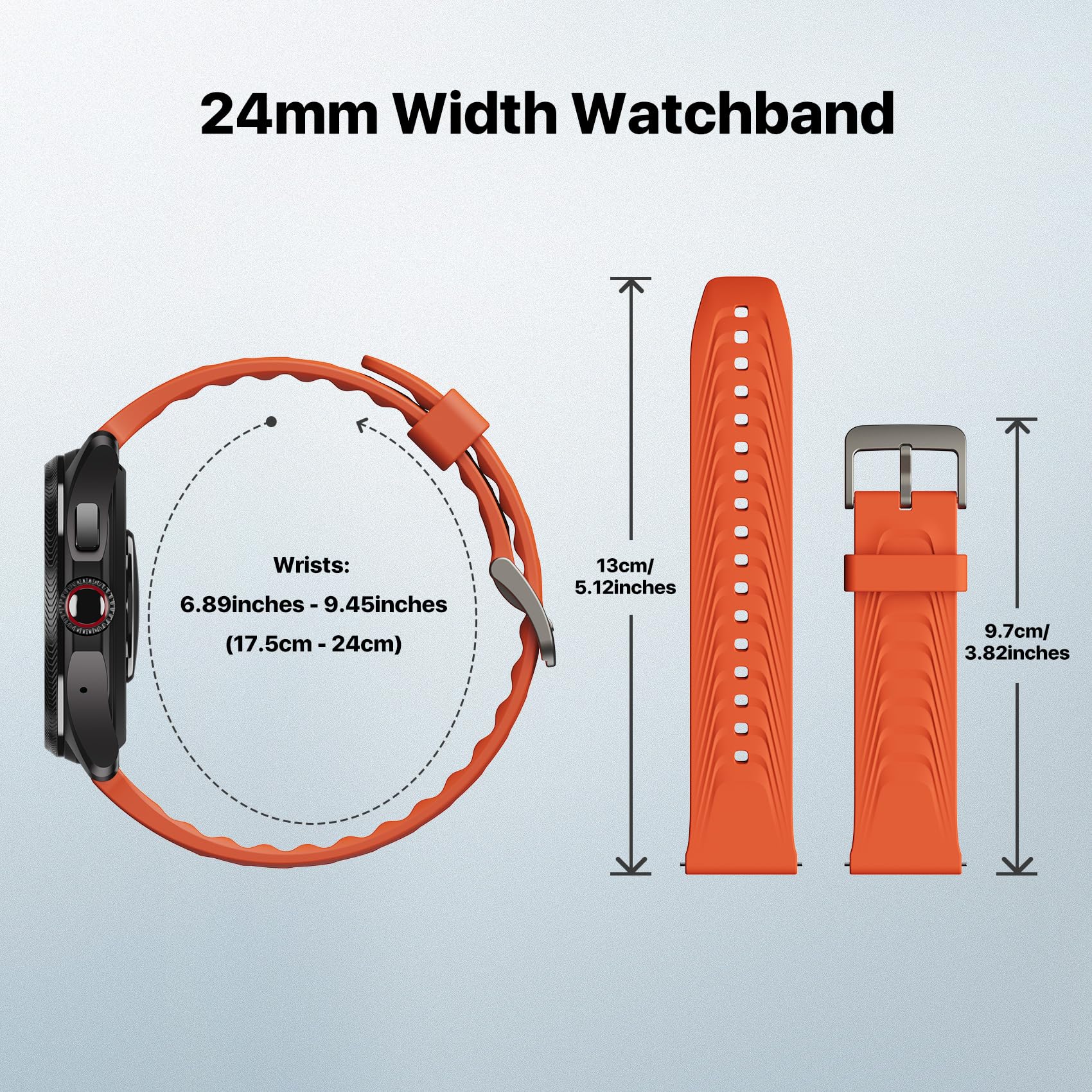 【Dimension】Bonfire Orange replaceable strap width: 24mm; Short side: 9.6cm/3.78inches, Long side: 12.55cm/4.94inches; Wrists: 6.89inches-9.25inches (17cm-24cm).