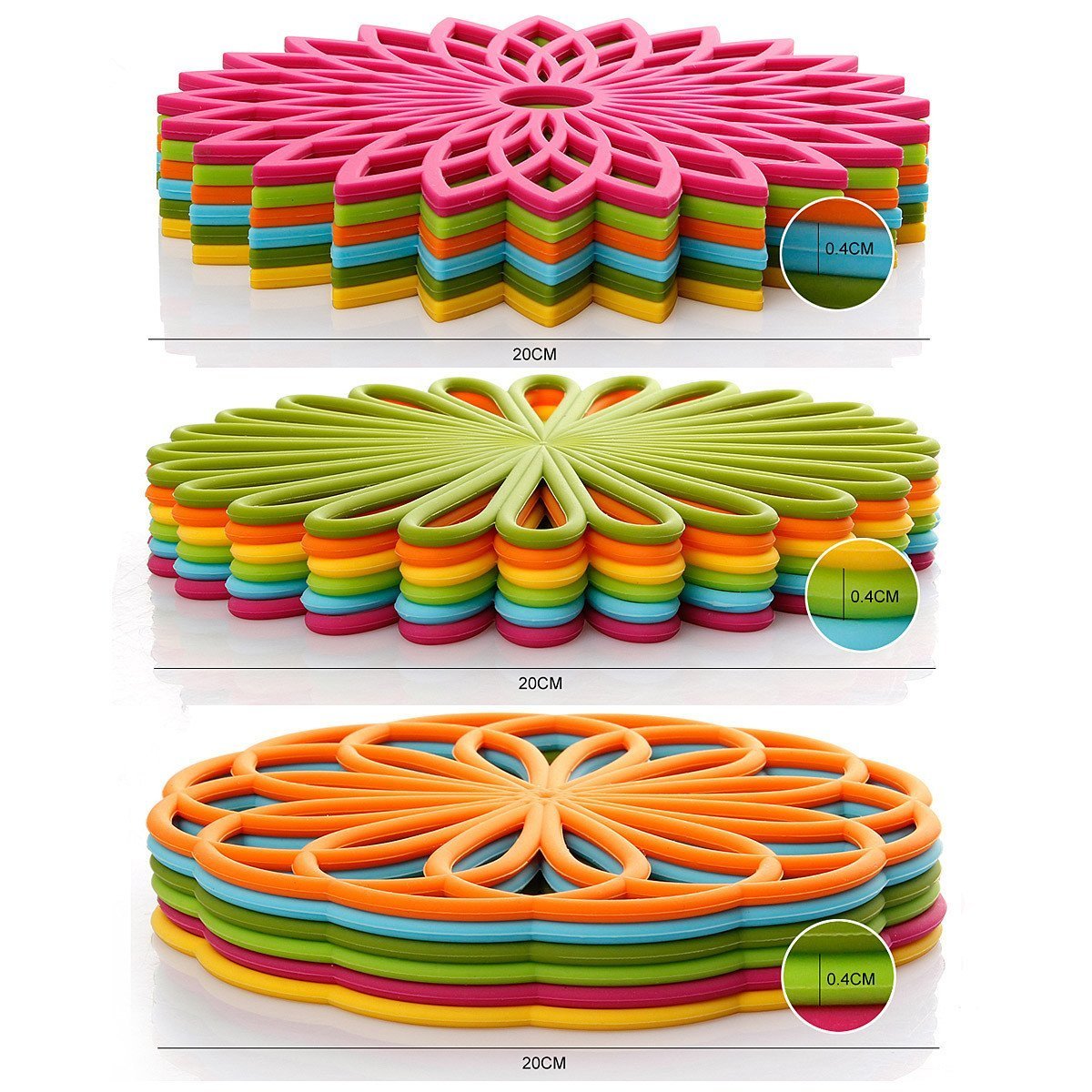 Multi-Purpose: The soft and flexible silicone trivets are versatile; Use it as a trivet to protect your kitchen surface from all scalding dishware. They are also suitable for kitchen mats, table mats, bowl mats, dish mats and pitcher coasters.