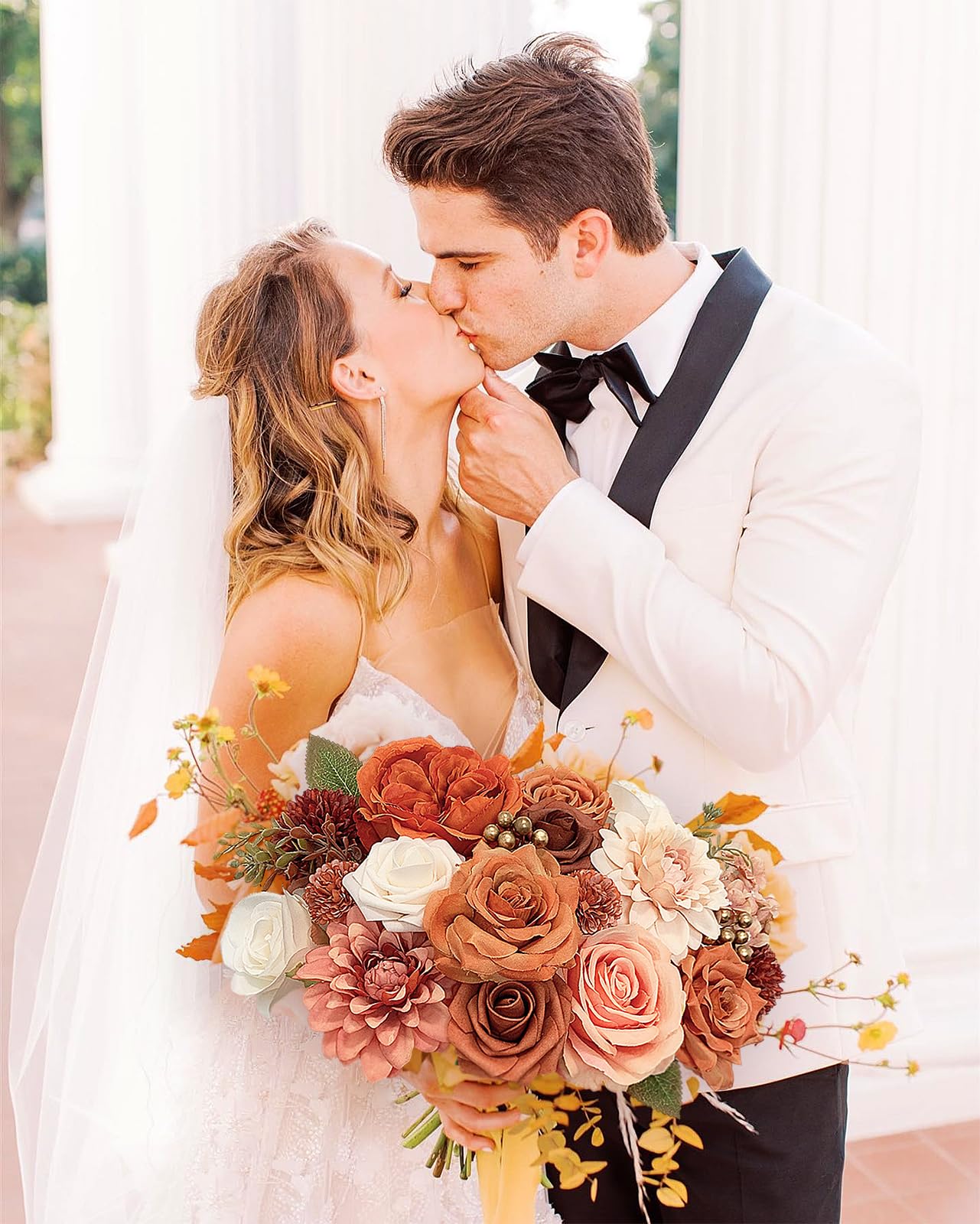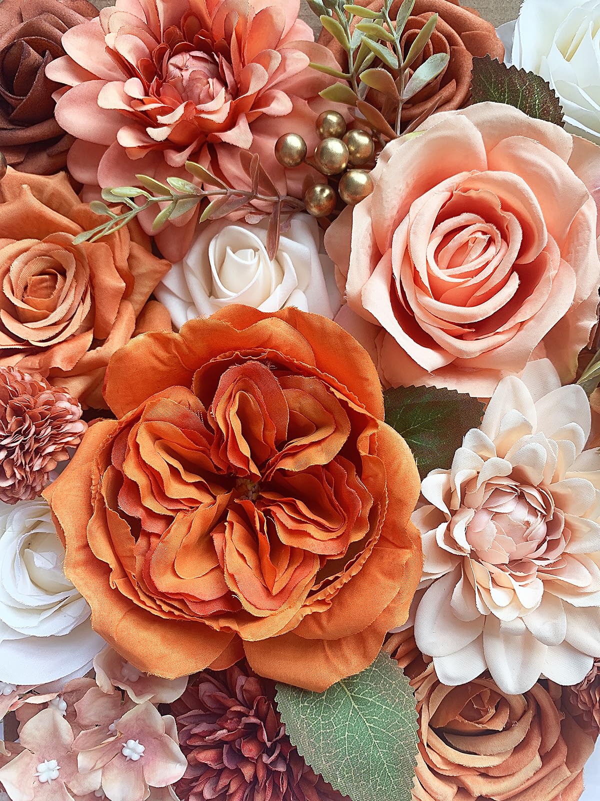 Orange Roses Artificial Flowers Set Quantity: A combo box packs a variety of flowers as vintage farmhouse or rustic themed wedding. A total of 19 fake flowers and 6 accessories, including mixed silk and foam orange roses artificial flowers with stems