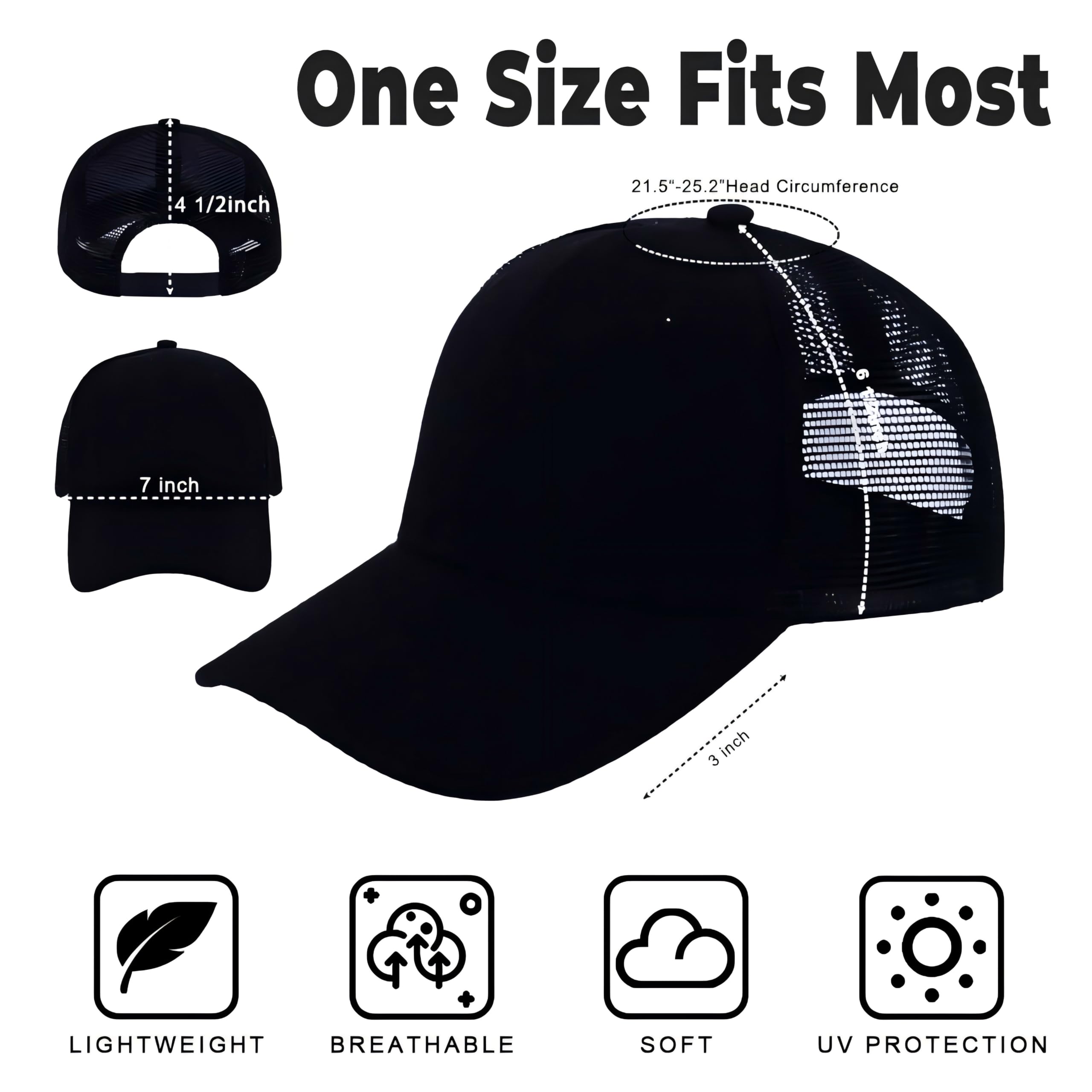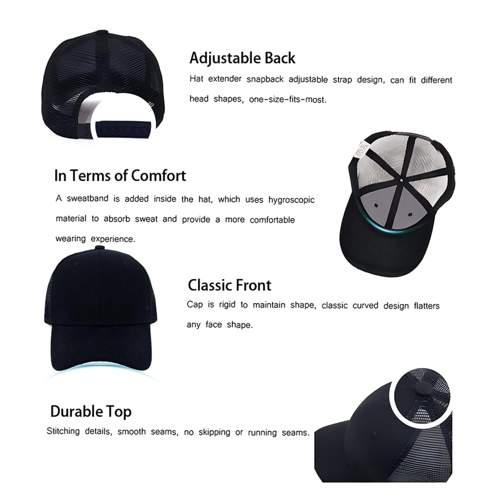 [Comfortable & Lightweight ]: Made from a durable blend of polyester and mesh fabric, our hats are lightweight and comfortable. The front panel and breathable mesh back ensure excellent ventilation , while the brim offers UV protection, making them ideal for outdoor activities.