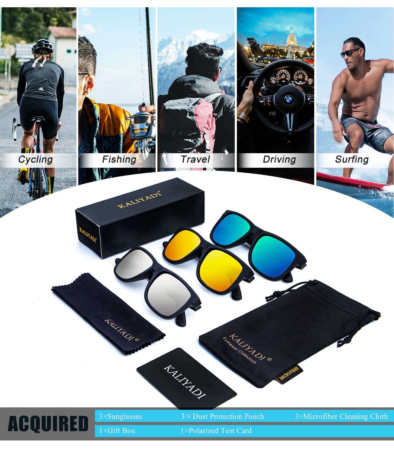 ★ Gift Idea Package and Brand Customer Service ▶ Classic sunglasses*3, microfiber pouch*3, microfiber glasses cleaning cloth*3, gift box*1. Our sunglasses for men women are also gift packed, which will be great gifts for your family and friends! All KALIYADI customers enjoy brand customer service for our polarized sunglasses. The integrity of every box and the quality of the lenses are double checked by third-party companies. And that goes with a lifetime support!