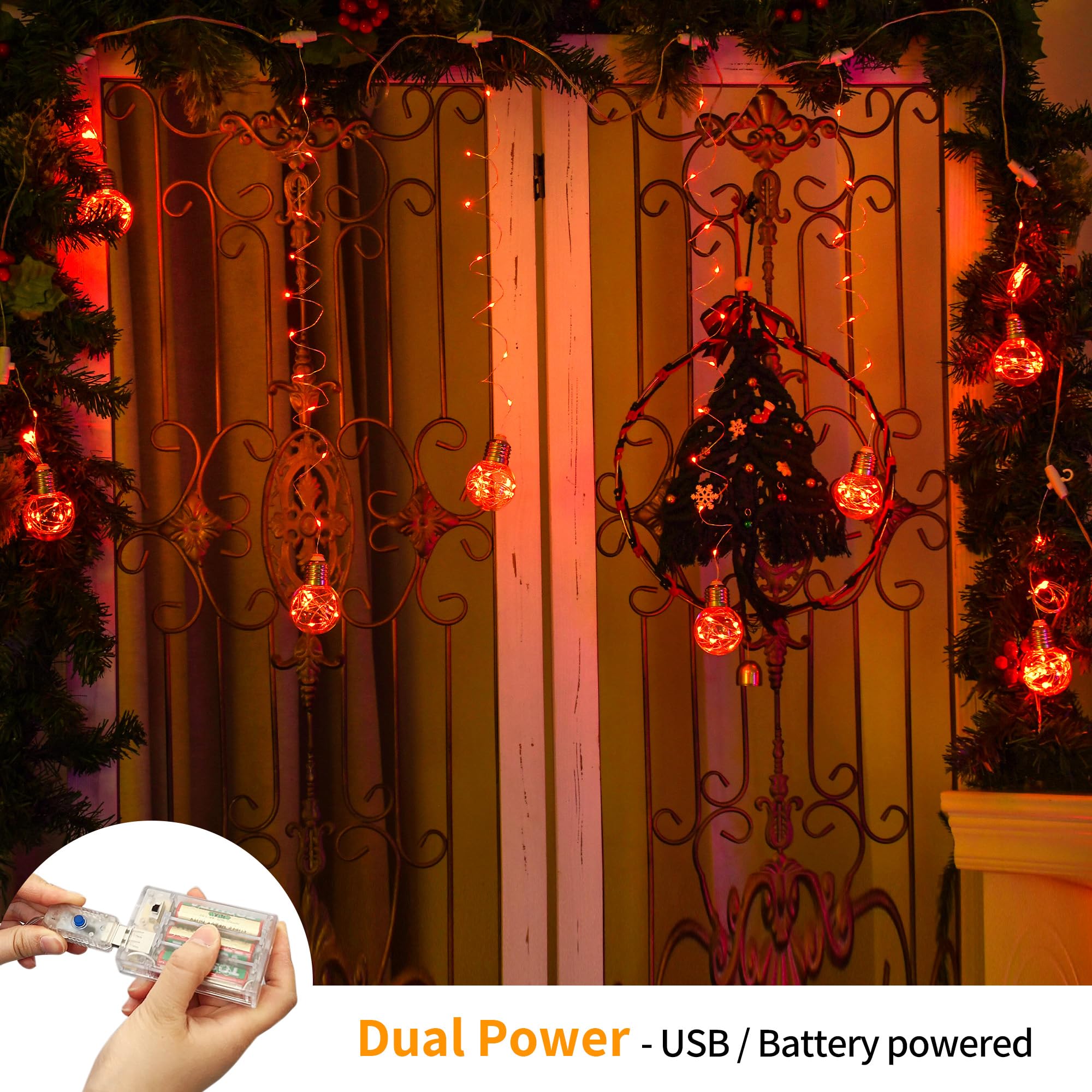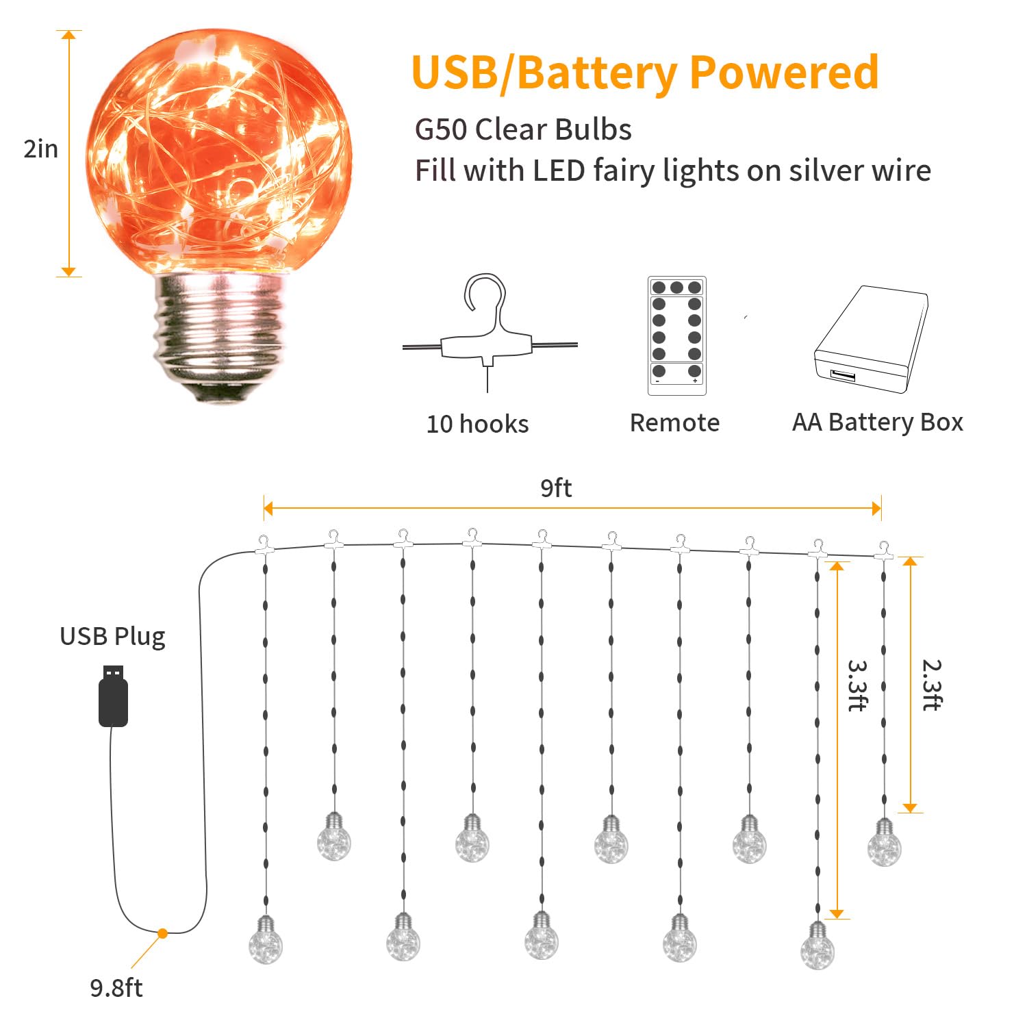 Now you can enjoy the delicate beauty of fairy lights woven inside magnificent globe light bulbs. Each bulb contains a strand of 10 to 13 LED fairy lights, hanging on silver wire LED curtain strings. Add a touch of creepy charm to your room, or transform your deck or patio into a party like no other, with these halloween curtain lights. Easy to hang across window, gallery wall, entryway, front porch, wall, etc. These orange curtain light are ideal to decorate a Halloween-themed party or event. Features USB power outputs 5V low voltage, safe to use. 8 different light settings to choose from- Combination, In waves, Sequential, Slo-glo, Chasing/Flash, Slow fade, Twinkle/Flash, Steady on. Remote control & Timer function for 6 hours of automatic illumination per day. Lightweight and Built in hooks for easy hanging. Delicate and flexible silver wire Easy to Insall: 1. Hang the horizontal stretch of the cord before your untie the vertical light strands. 2. Untwist the cable tie and let the silver wire strands hang down. 3. Unsrew the bulb a little bit, remove the protective bag and re-tighten the bulb. Specification> Power: 5V USB Plug / 3 x AA Batteries ( Batteries not included) Length:9.8ft Drop Length: 3ft/2.3ft, total 10 Drops LEDs quantity: 200 LEDs Lead Cable Length: 9.8 ft Number of light bulbs: 10 Bulb Size: 2 inch diameter Remote Control Method: Infrared Remote Control Distance: 10ft Notice: The remote receiver is built in the USB plug, please point the remote in the direction of the USB plug to control. Infrared remotes require line-of-sight and the infrared signal won't transmit through walls or around corners.