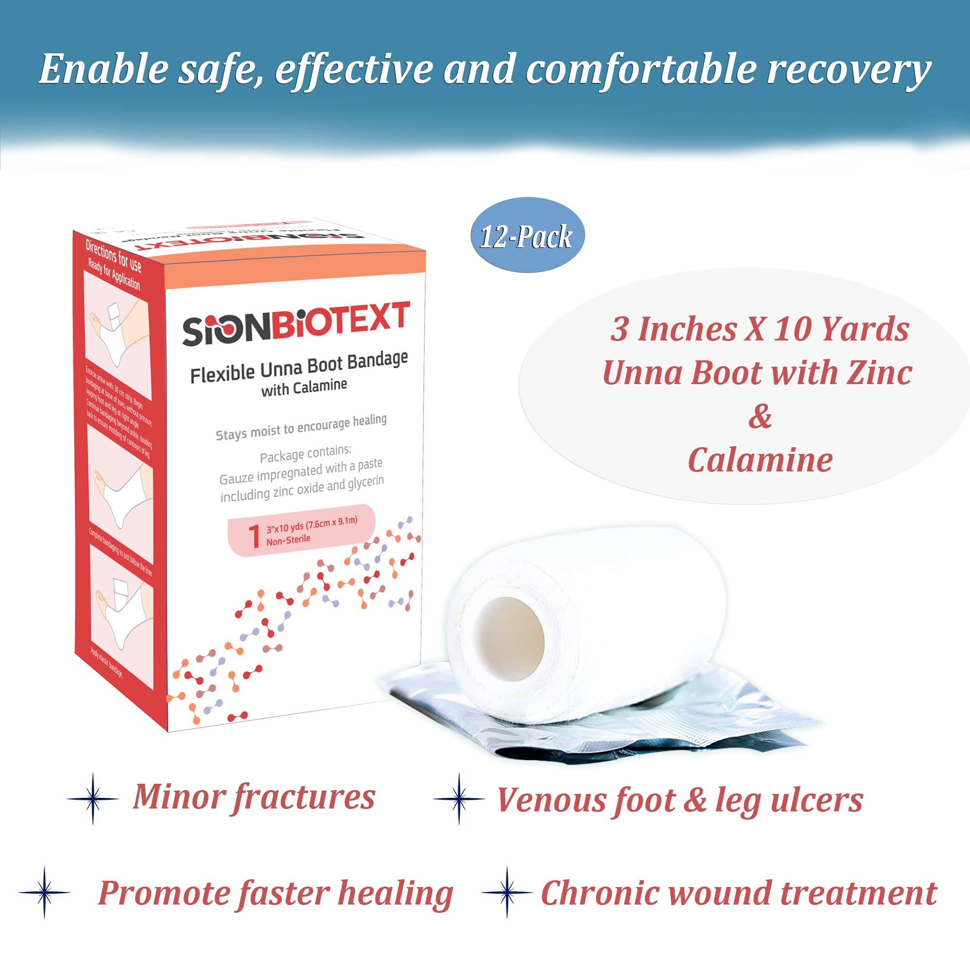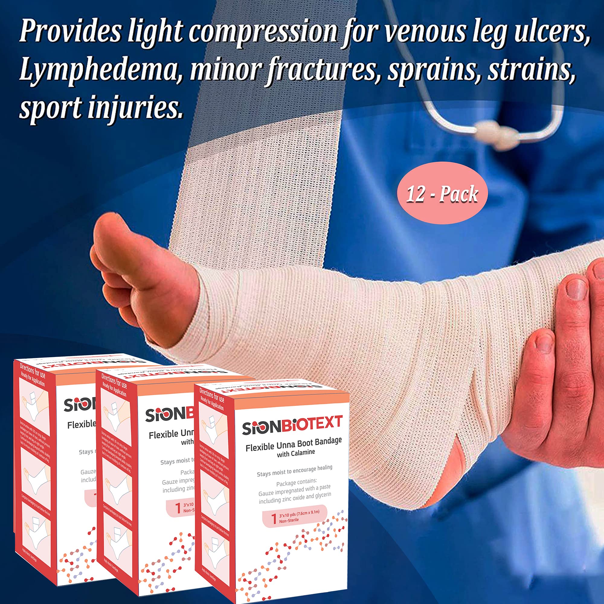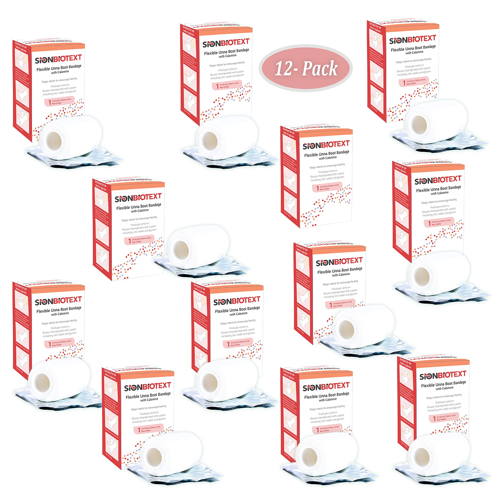100% SATISFACTION GUARANTEE - Contains 12 (Full Case) Unique, Easy-to-Open, Non-Sterile individually foil wrapped Sion Biotext Unna boot stockinette 3 inch bandages.