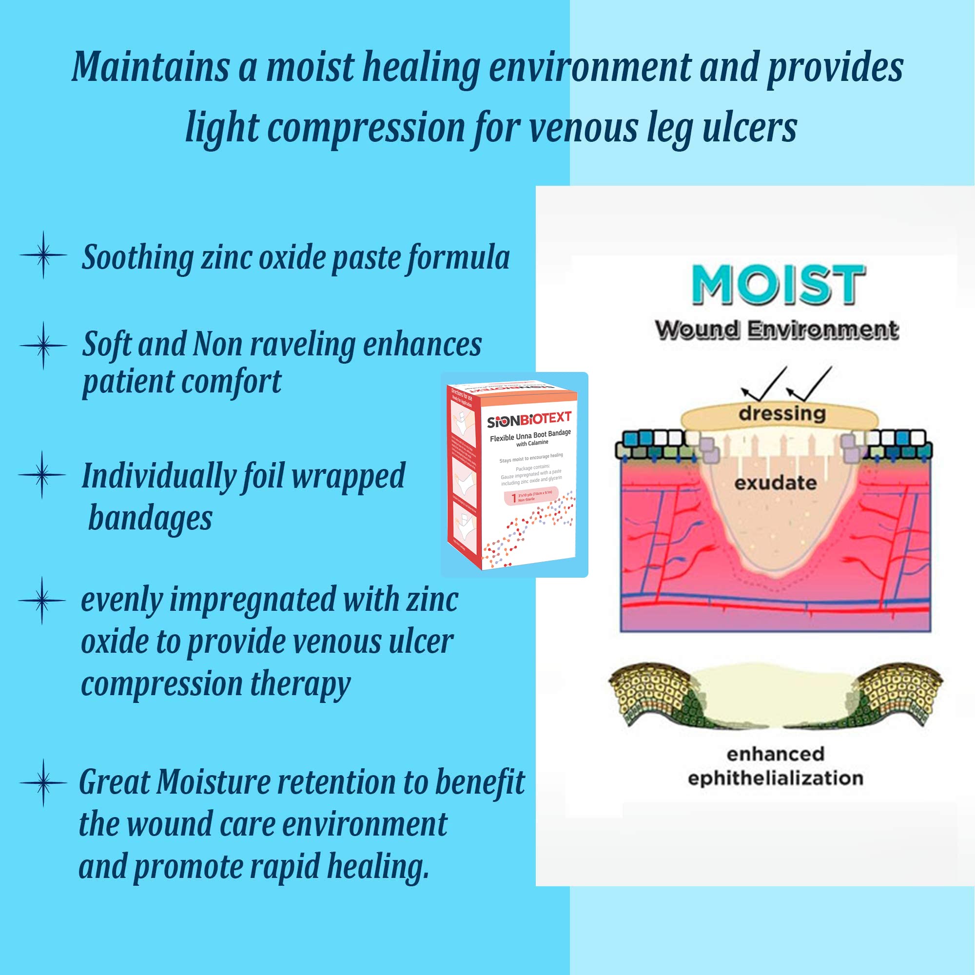 HELPS TO EASE ITCHING - Enhances patient comfort. The zinc oxide paste and the calamine in the Unna Boot helps ease skin irritation and keeps the area moist. This evenly impregnated gauze bandage helps to ease itching, essential ankle first aid kit
