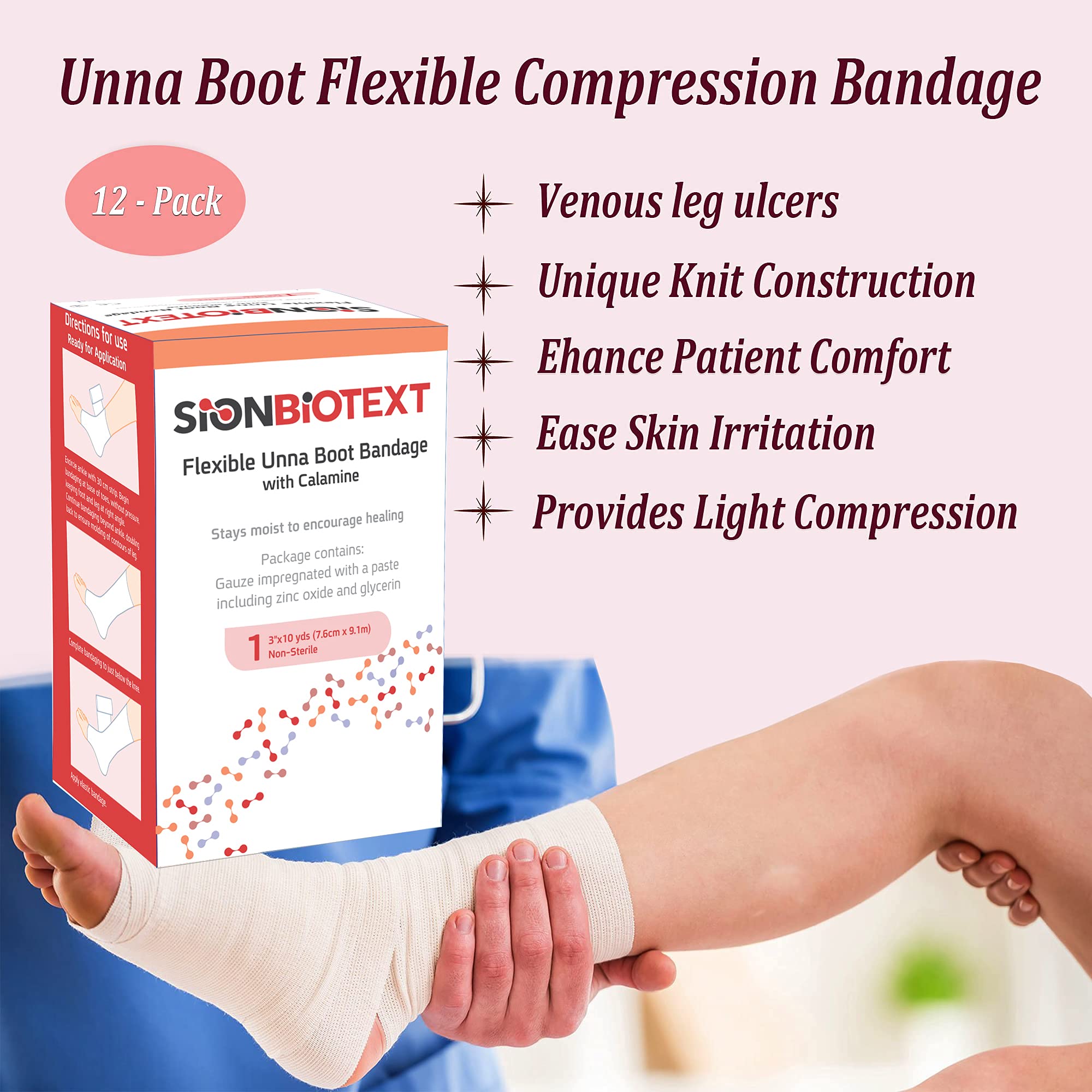 UNIFORM DISTRIBUTION OF PASTE - Sion Biotext Unna Boot Bandages are infused with zinc oxide paste and calamine. Unique knit construction allows for a more uniform distribution of paste, effective wound care supplies for ulcers