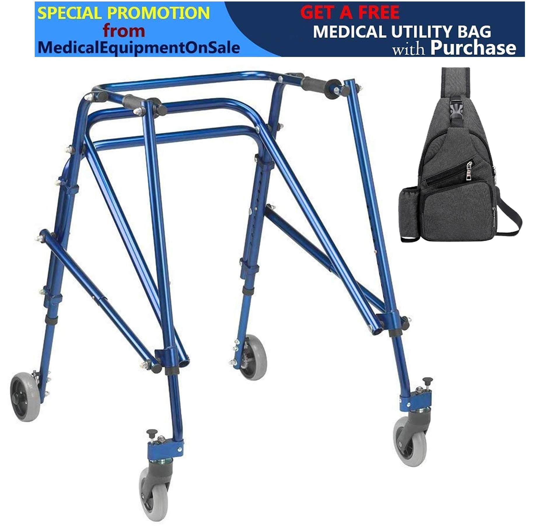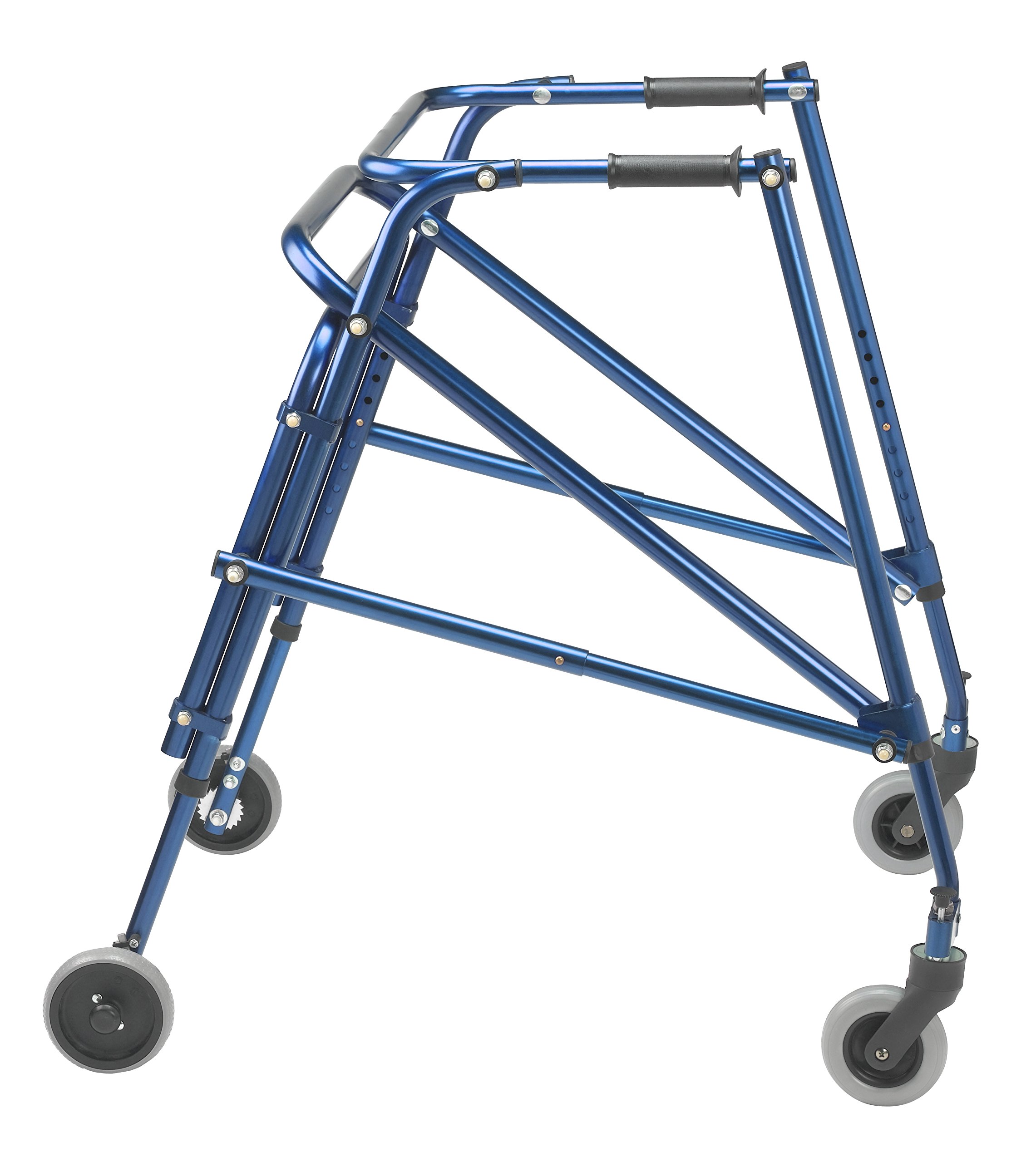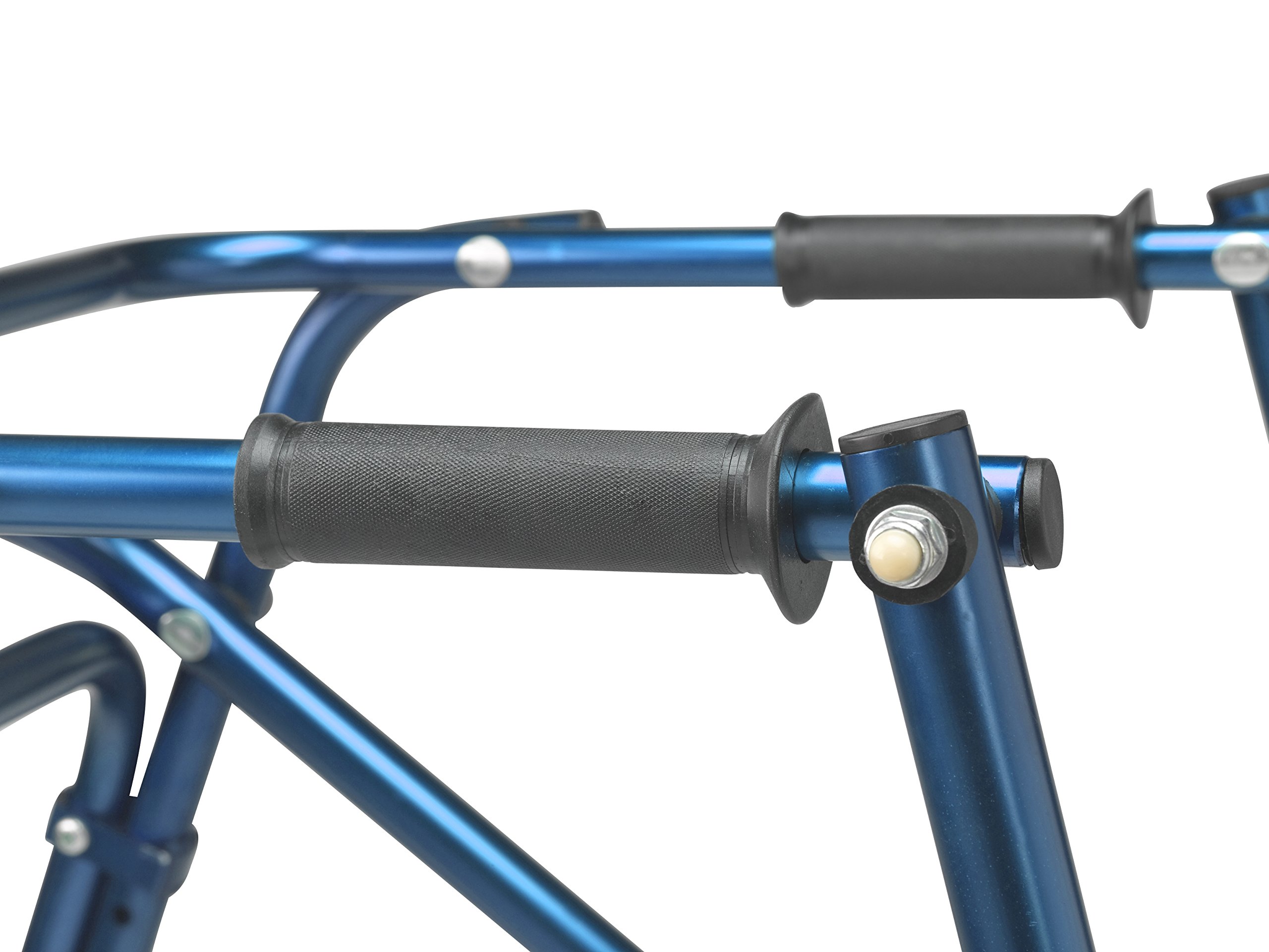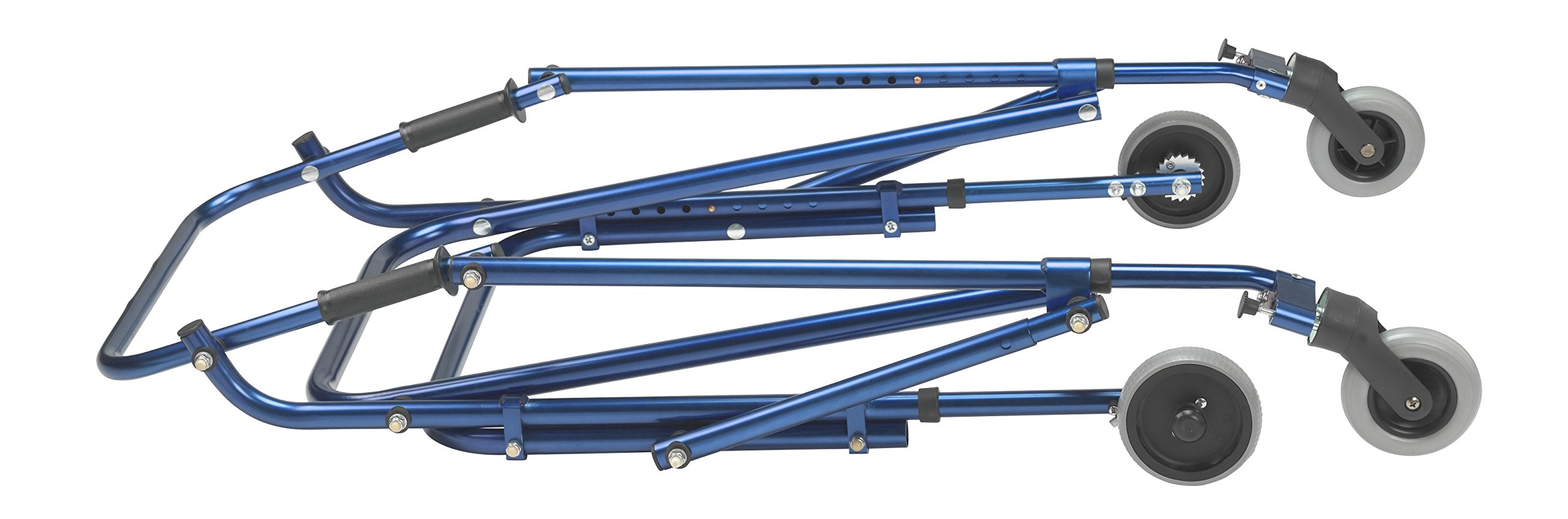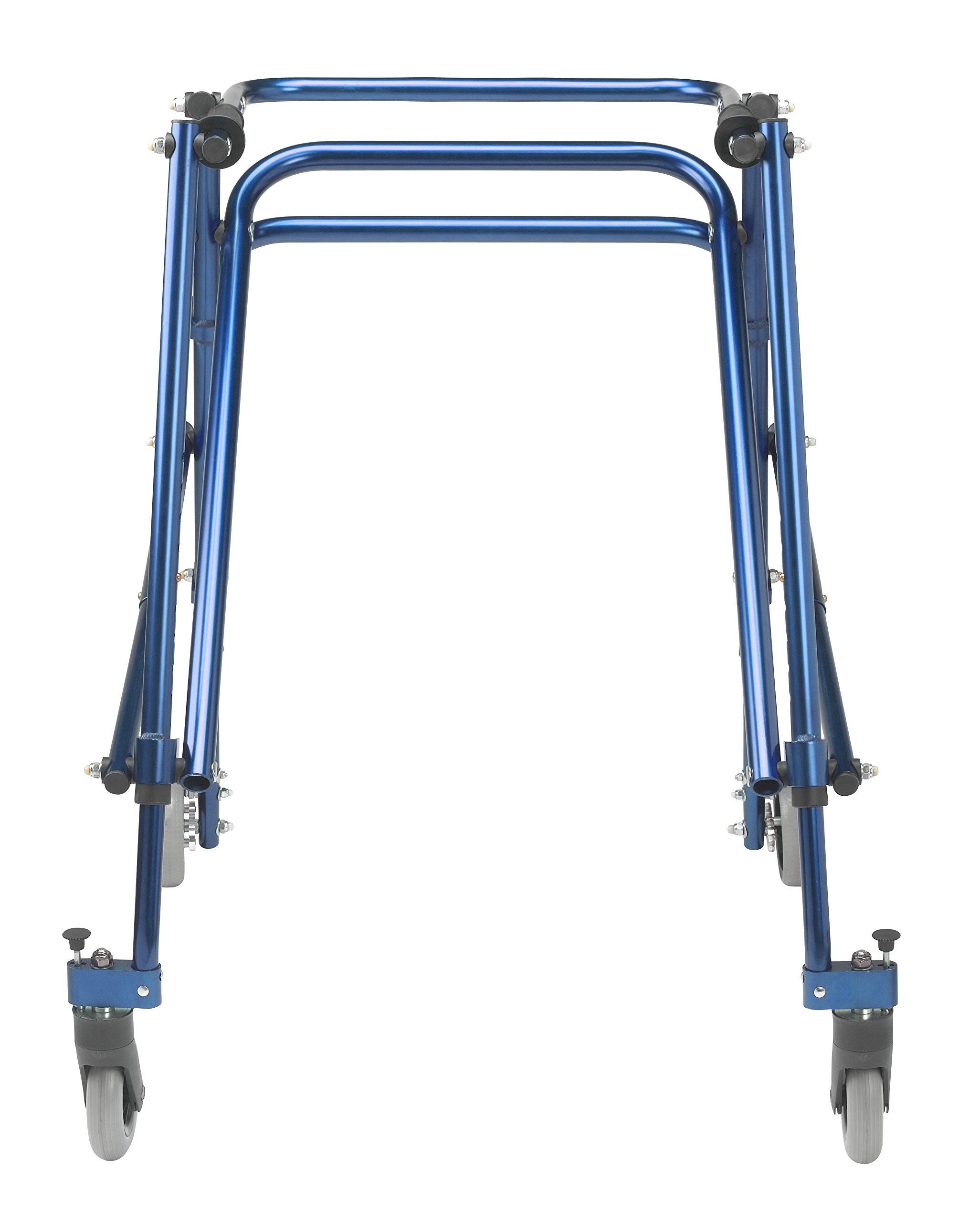 Drive Medical Nimbo 2G Posterior Walker – Large, Knight Blue The Drive Medical Nimbo 2G Posterior Walker is designed to provide mobility support for users who need assistance with balance and walking. Suitable for both children and adults, it features a lightweight aluminum frame that adjusts to five height settings for a personalized fit. The walker folds for transport and storage, making it a practical solution for daily use. This model includes a redesigned handgrip for improved user comfort and soft rubber rear wheels with a one-directional ratchet mechanism that helps prevent the walker from rolling backward. The front wheels can be set to swivel or locked in place for additional control, and a directional override bracket allows for forward and reverse movement when needed. Features: Height-adjustable frame with five settings (28"–36") Lightweight aluminum construction (14 lbs) Folds easily for transport and storage Ergonomic handgrip design Soft rubber rear wheels with anti-reverse mechanism Directional override bracket for two-way movement Swivel or non-swivel front wheel settings Specifications: Handle Height: 28" – 36" Inside Handgrip Width: 16.5" Overall Dimensions: 34" W x 26.5" L x 28" H Product Weight: 14 lbs Weight Capacity: 190 lbs Material: Aluminum Color: Knight Blue Model Number: KA4200-2GKB Warranty: 1-Year Limited