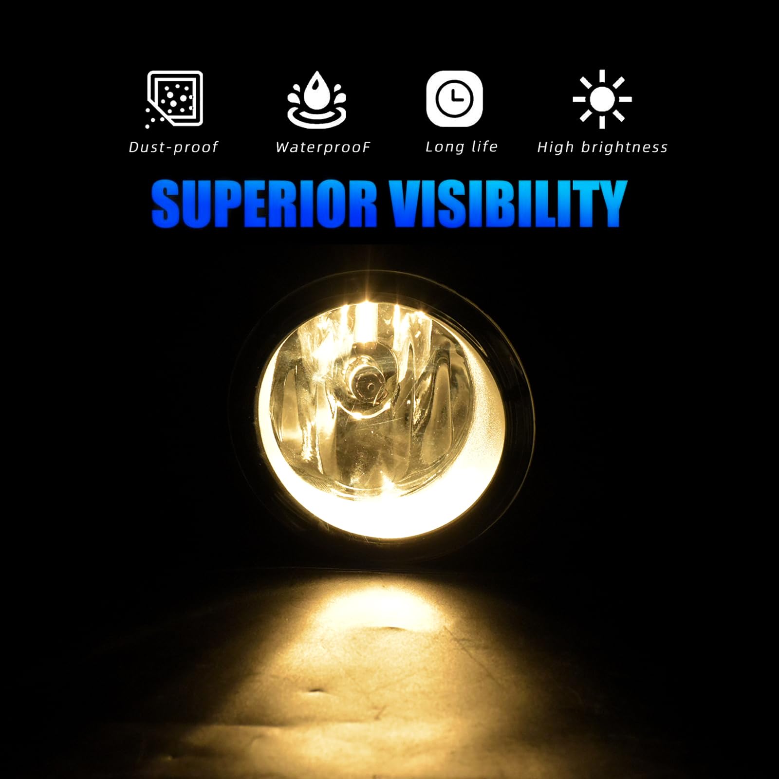 Built Tough: Our sealed fog lights resist moisture and dust, ensuring durability and impact resistance in all weather. Featuring a high-transmittance glass lens with UV and heat resistance, and sturdy OEM-grade housing