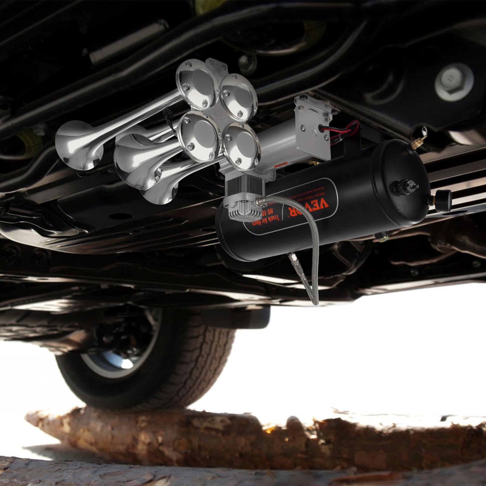 150DB Train Horns Kit: Our train horn kit delivers a robust 150dB sound with strong penetration. Ideal for long-distance driving, sharp turns, and adverse weather conditions. It effectively alerts cars, pedestrians, and animals. The electric train horn kit includes 4 trumpet air horns, a solenoid valve, a 2.6-gallon tank, a compressor, and pipes. (Note: Power switch and cord not included.)