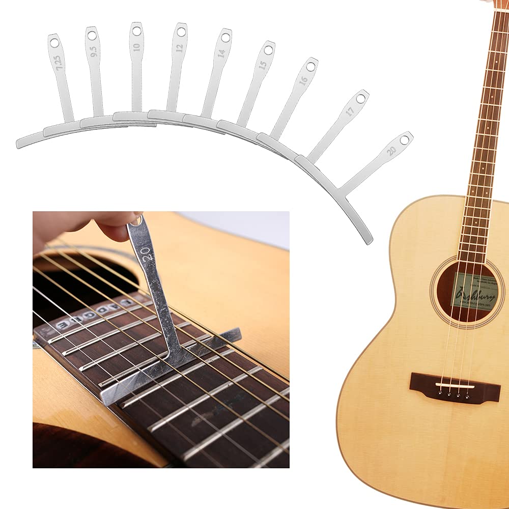 【9 Pcs String Radius Guage】String radius gauge set including: 7.25", 9.5", 10", 12", 14", 15", 16", 17" and 20" radius. Fretboard radius gauge is small and light, easy to carry and store. A must have for bass guitar maintain and adjustment.