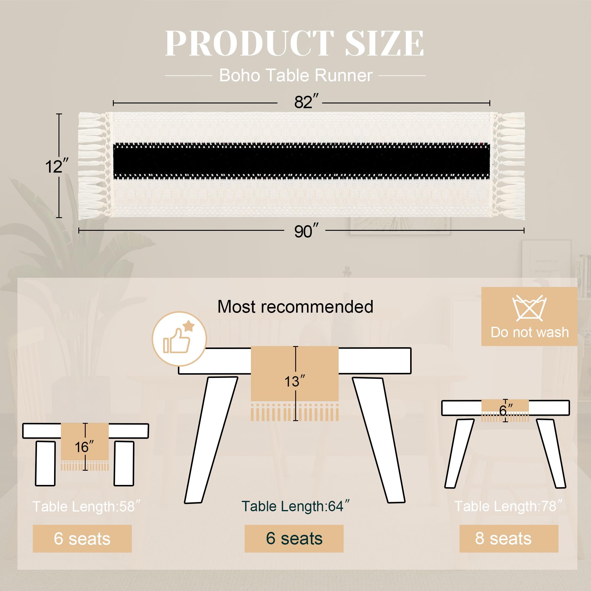 [Perfect 90 Inches Long] Our macrame table runner with tassels measures 12 x 90 inch, fits a dining table that seats 4-8 people. It can give your tables a rustic and boho look. (Because it is folded in the bag, when you take it out, the table runner will have creases, which will affect your measurement. So, please make sure the table runner is placed neatly and flat before measuring)