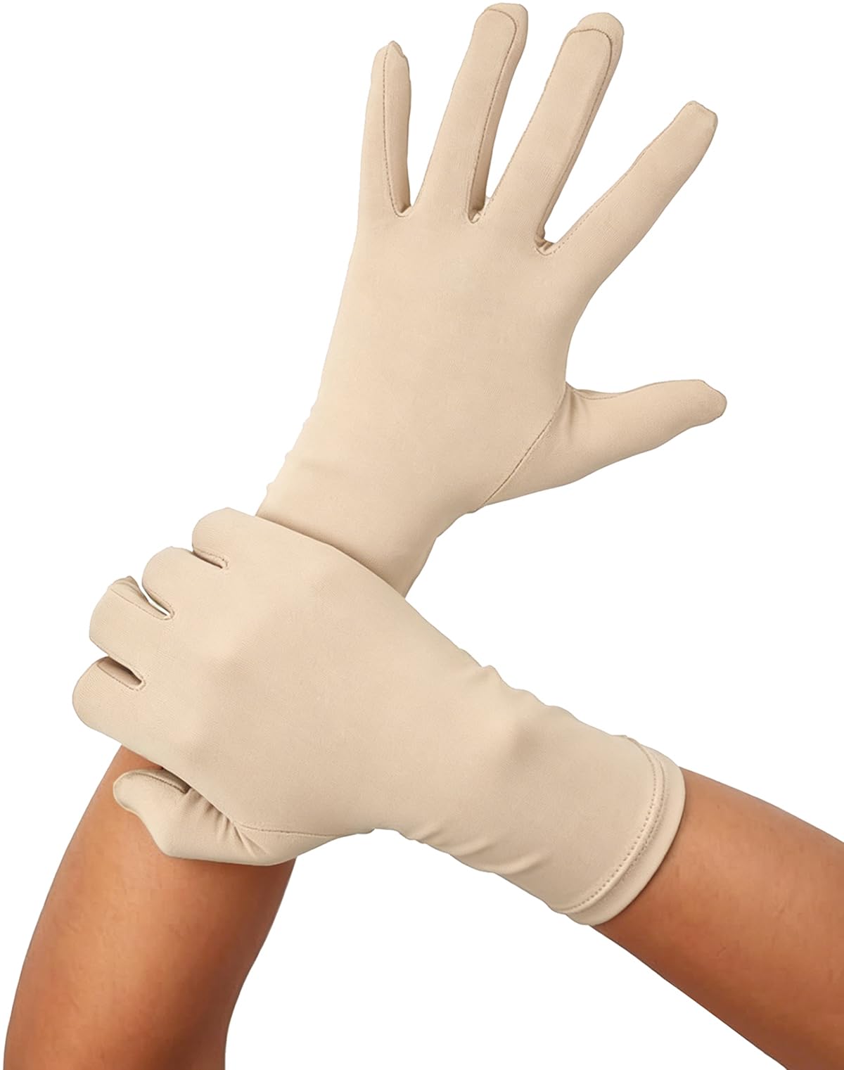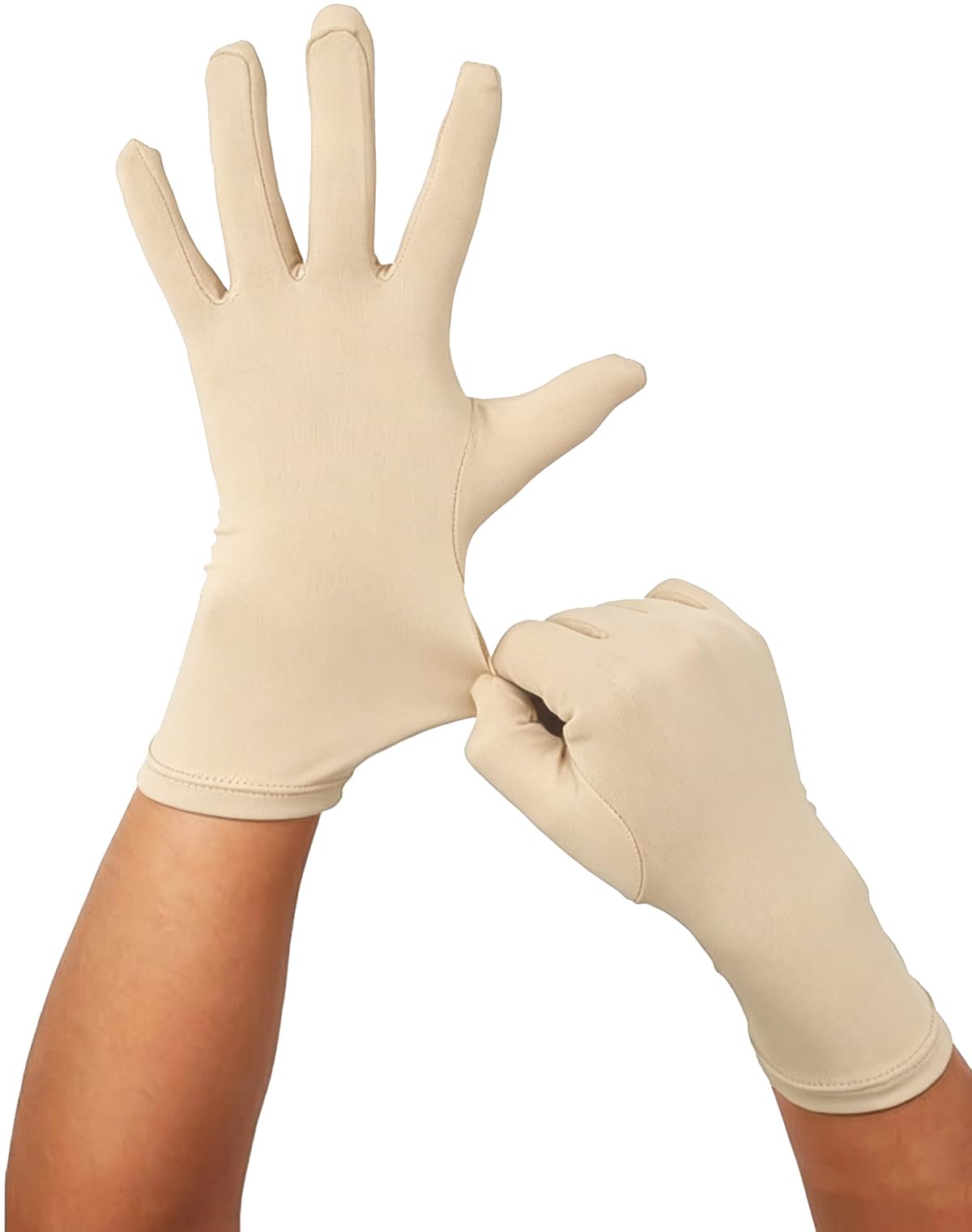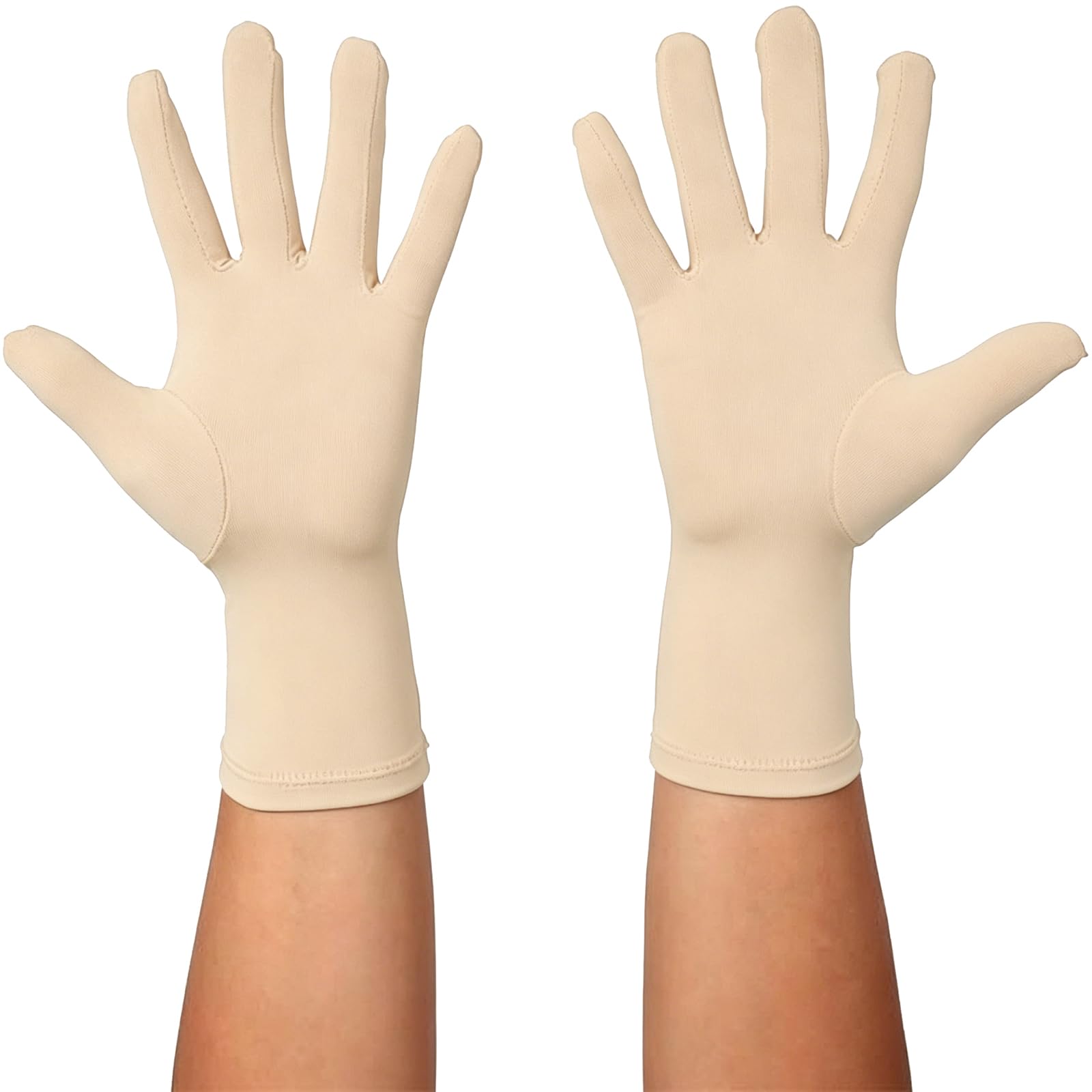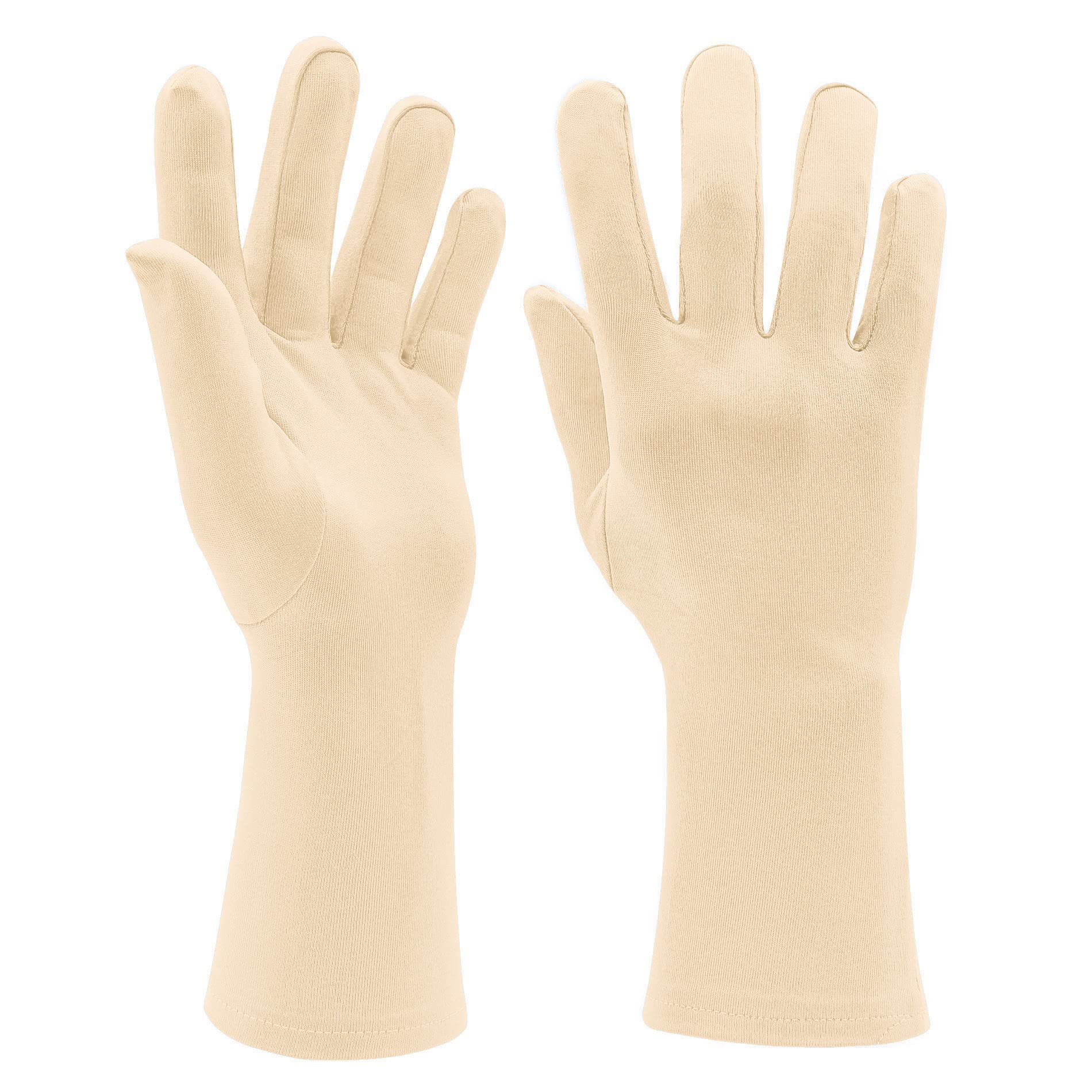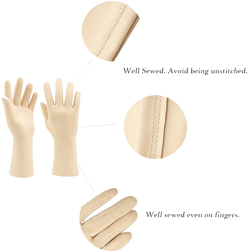 One size fits most with strong elasticity. The length from middle finger to wrist is approx. 9 inches
