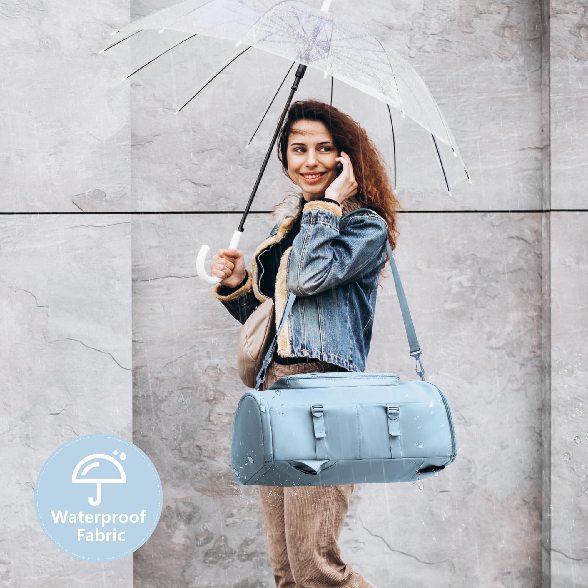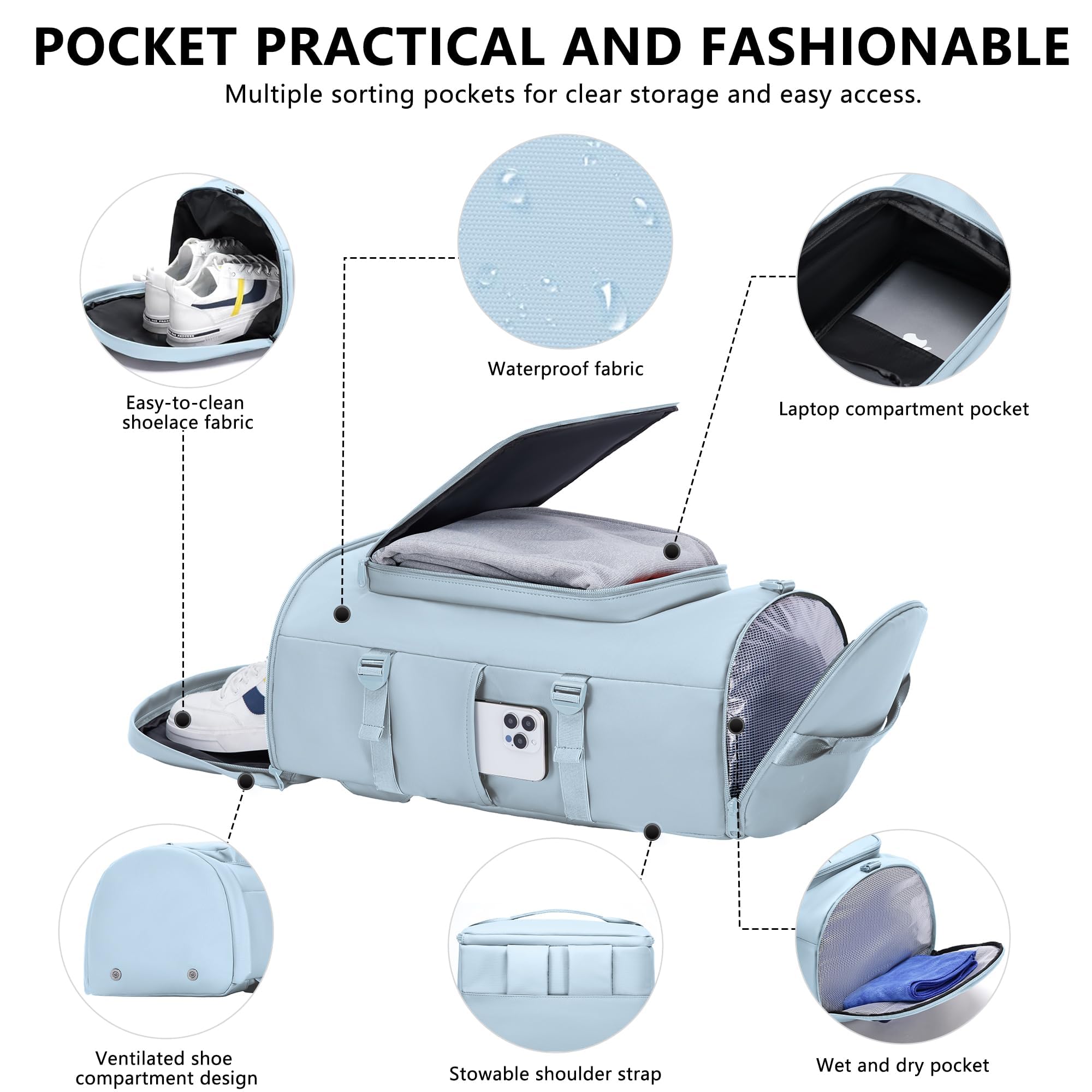 Waterproof & Wrinkle-Resistant Fabric: Even in the rainy days, you do not have to worry about wetting this weekender overnight bag. This duffel bag's fabric is well performed in anti-wrinkle, even if the travel backpack is squeezed by other heavy items for one year, you will not find wrinkles when you use it again