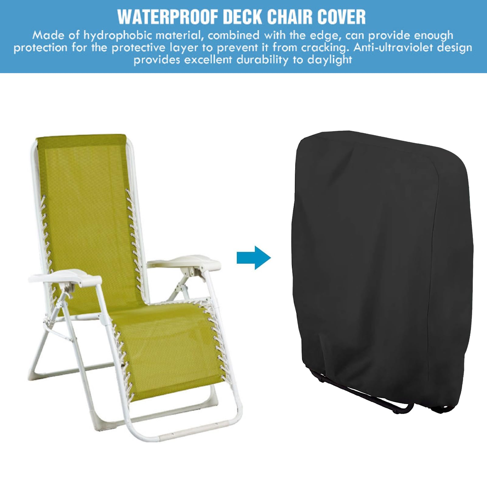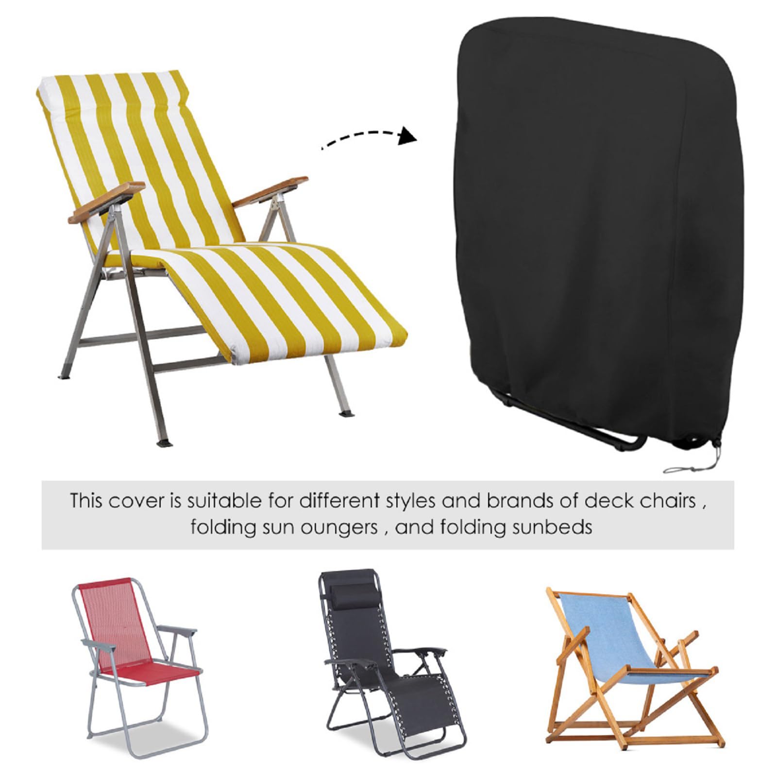 The folding recliner chair cover can protects your chair from dirt and dust Keep your folding recliner chair clean and safe, avoiding being covered a layer of dust on your outdoor chairs after a period of inactivity, no need to clean up the chair when you sit in it next time. The adjustable hem cord with toggle allows adjustment for a tight, securely covering in the windy days, easy on and easy off, keeps your chair dry and clean in the backyard/garden. Material: 190T Polyester fabric Weight: 0.3kg Colour: Black / Beige Product size: 32.3 inch W x 7.87 inch D (Bottom) x 36.6 inch (82 cm×20 cm×93 cm) Package size: 8.7 inch × 6.8 inch × 2.4 inch(22 cm×18 cm×6 cm) Package include: 2 x Folding recliner chair cover 2 x Storage pouch