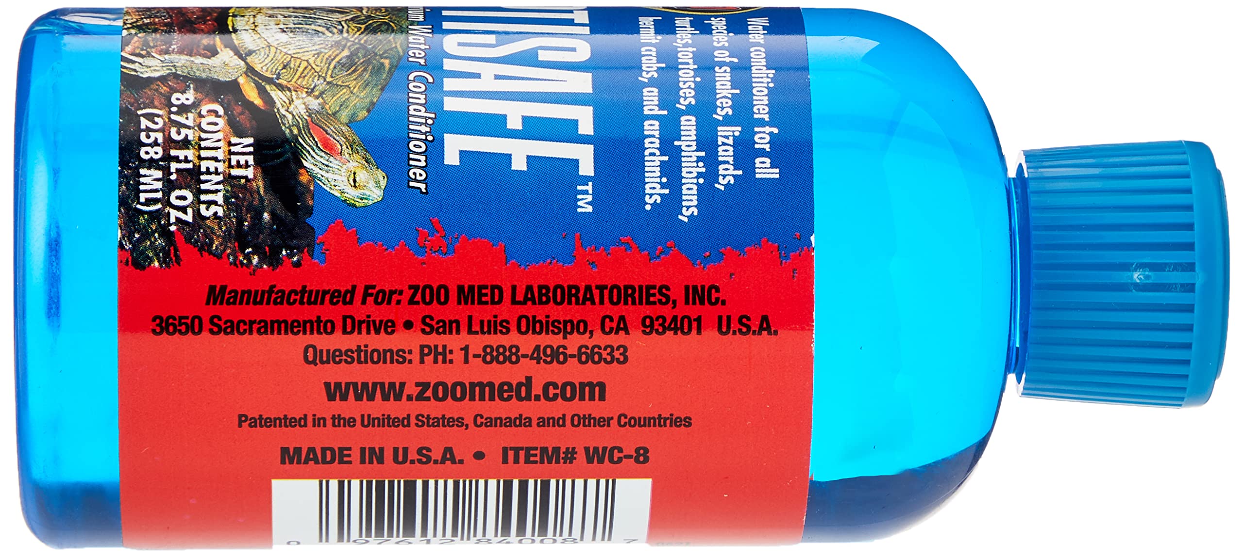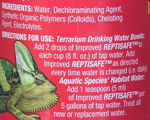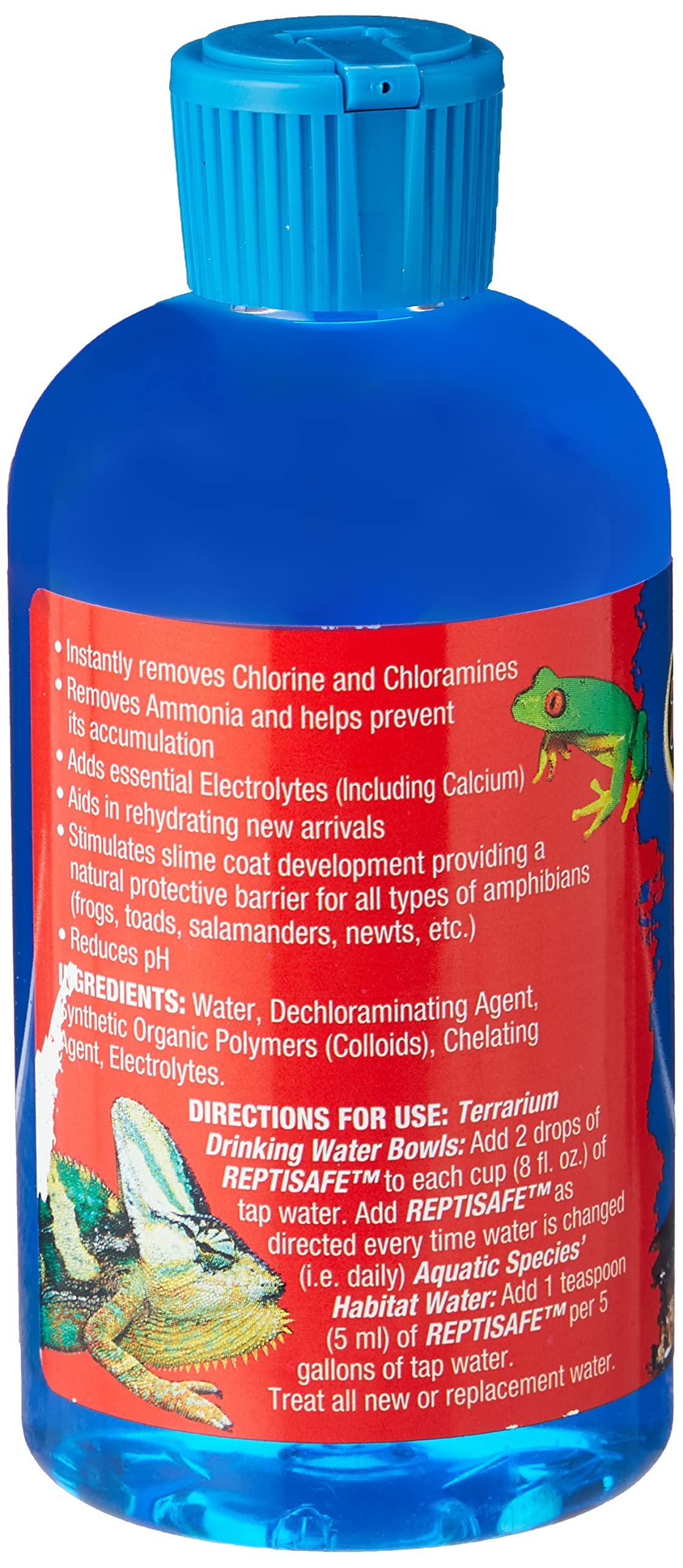 The first instant terrarium water conditioner. Great for reptile water bowls, chameleon drip water systems, amphibian enclosures, and aquatic turtle tanks. ReptiSafeâ„¢ removes chloramines and chlorine, detoxify es ammonia and nitrites, and provides essential ions and electrolytes which help to hydrate newly acquired animals. Also stimulates slime coat development in amphibians and fish.