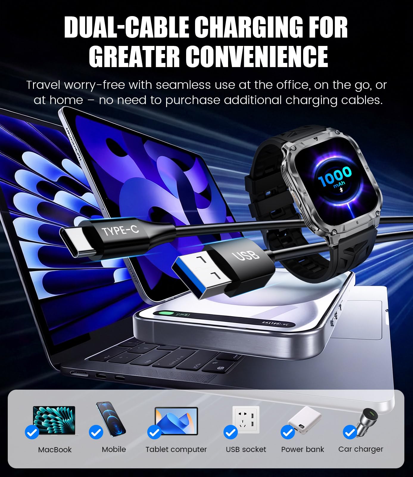Dual Cables Included: Never Hunt for a Cable Again! Your time is valuable. Stop wasting it looking for a charger. We provide both USB and Type-C cables, giving you the ultimate flexibility to power up your watch anywhere. Keep one in your car for commutes and the other at your desk or bedside. However you charge, you're always ready to go.
