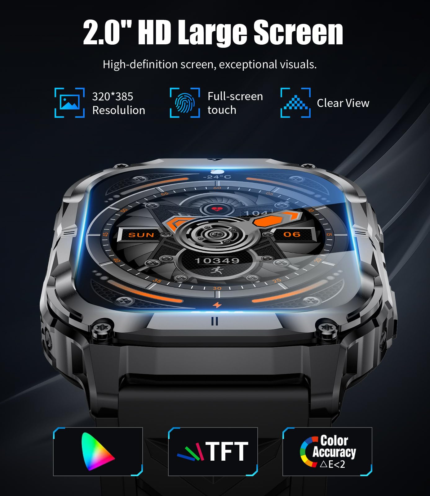 Vibrant 2.0" HD Touchscreen, Crystal-Clear Even in Sunlight: Forget squinting at a tiny screen. The optimized square interface delivers notifications and data with stunning clarity. Whether you're quickly checking a text from your buddy or navigating your music playlist on a hike, it’s designed for instant readability - this smart watch just like your smartphone, but on your wrist.