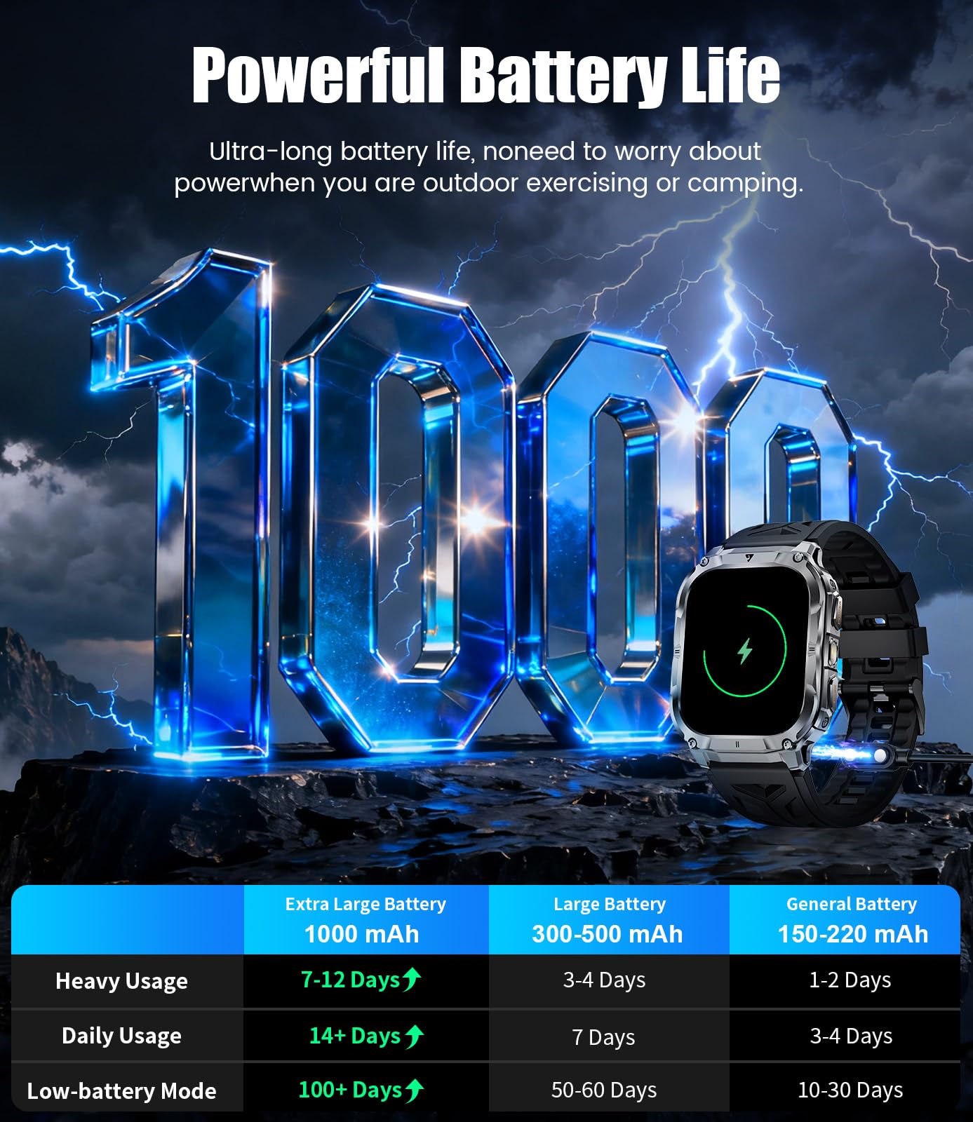 Built for Readiness: Week-Long Power and an Essential LED Flashlight. Forget the daily charging ritual. The massive 1000mAh battery powers through your week, from Monday's grind to Saturday's exploration. Plus, smart watch bulit in-LED flashlight is your essential tool for power outages, pre-dawn runs, or finding keys in the dark—because true readiness is always on.Be Prepared, Never Power Down.