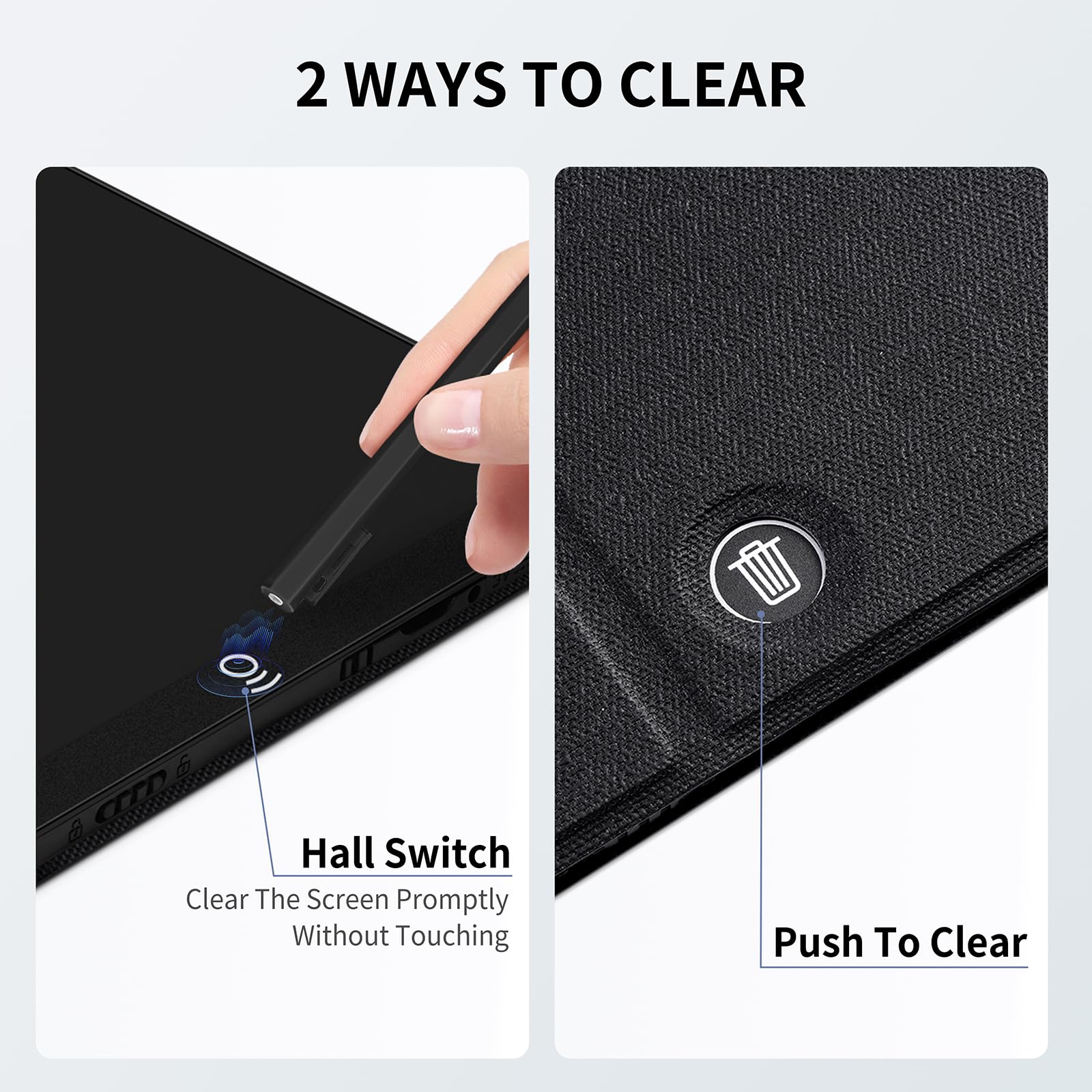 2 Ways Erase: The writing tablet design non-touch and push erase; The non-touch erasing on the front of the writing tablet, while a push-erase button on the back; The erase of the writing tablet can clear the screen content instantly, time and energy saving; Turn on the lock screen button to avoid the recorded message being deleted accidently, and the screen can be erased when the writing pad unlocked