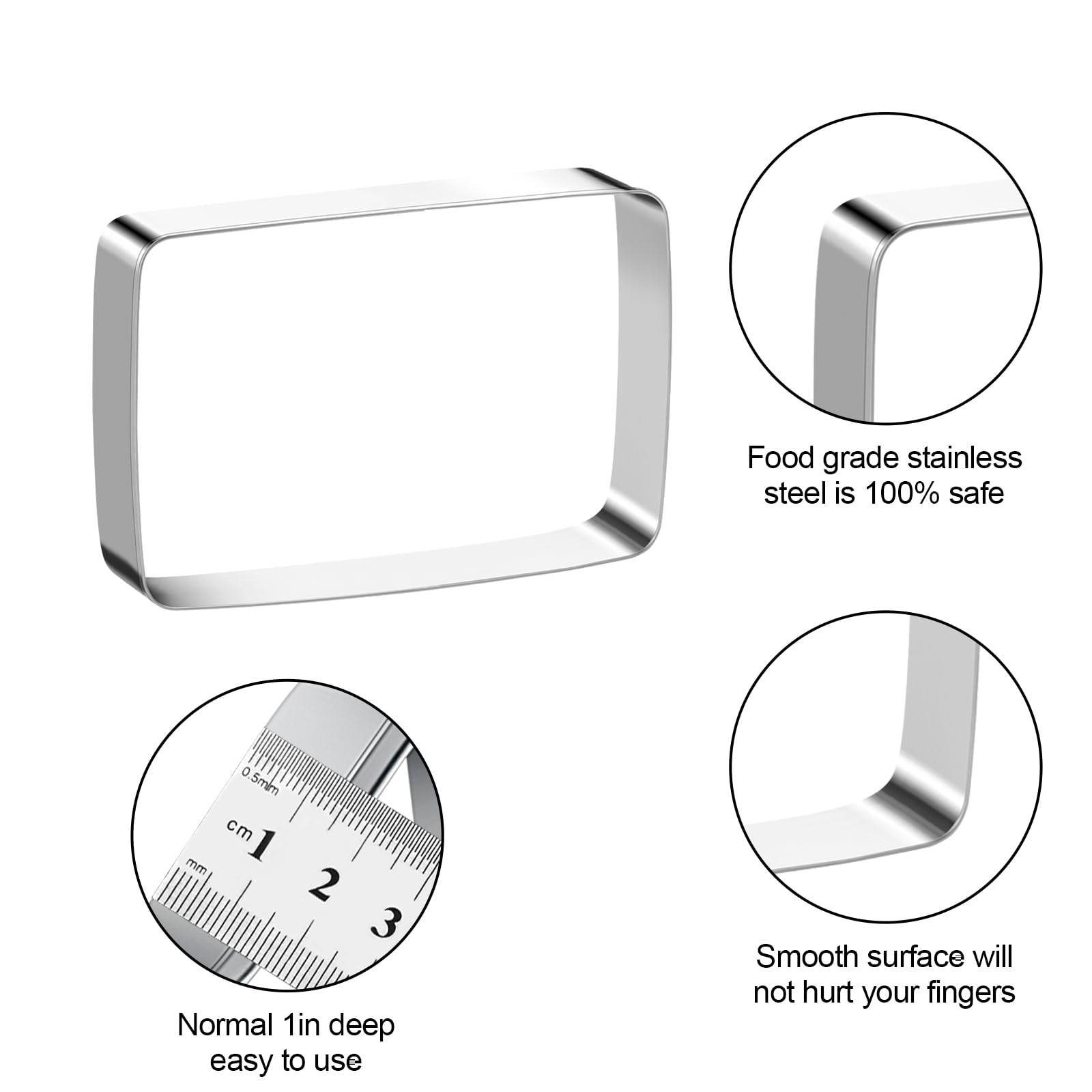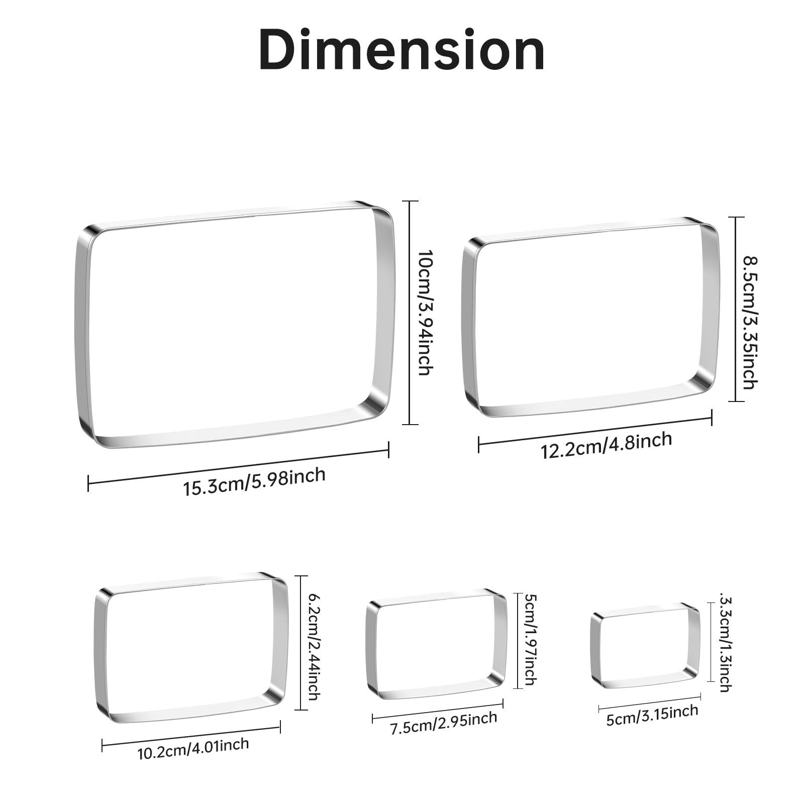 Includes: 5 pieces Rectangle Molds with different size: ( 5.9*3.74, 4.8*3.15, 3.93*2.56,2.95*1.93,.97*1.34 )inches.