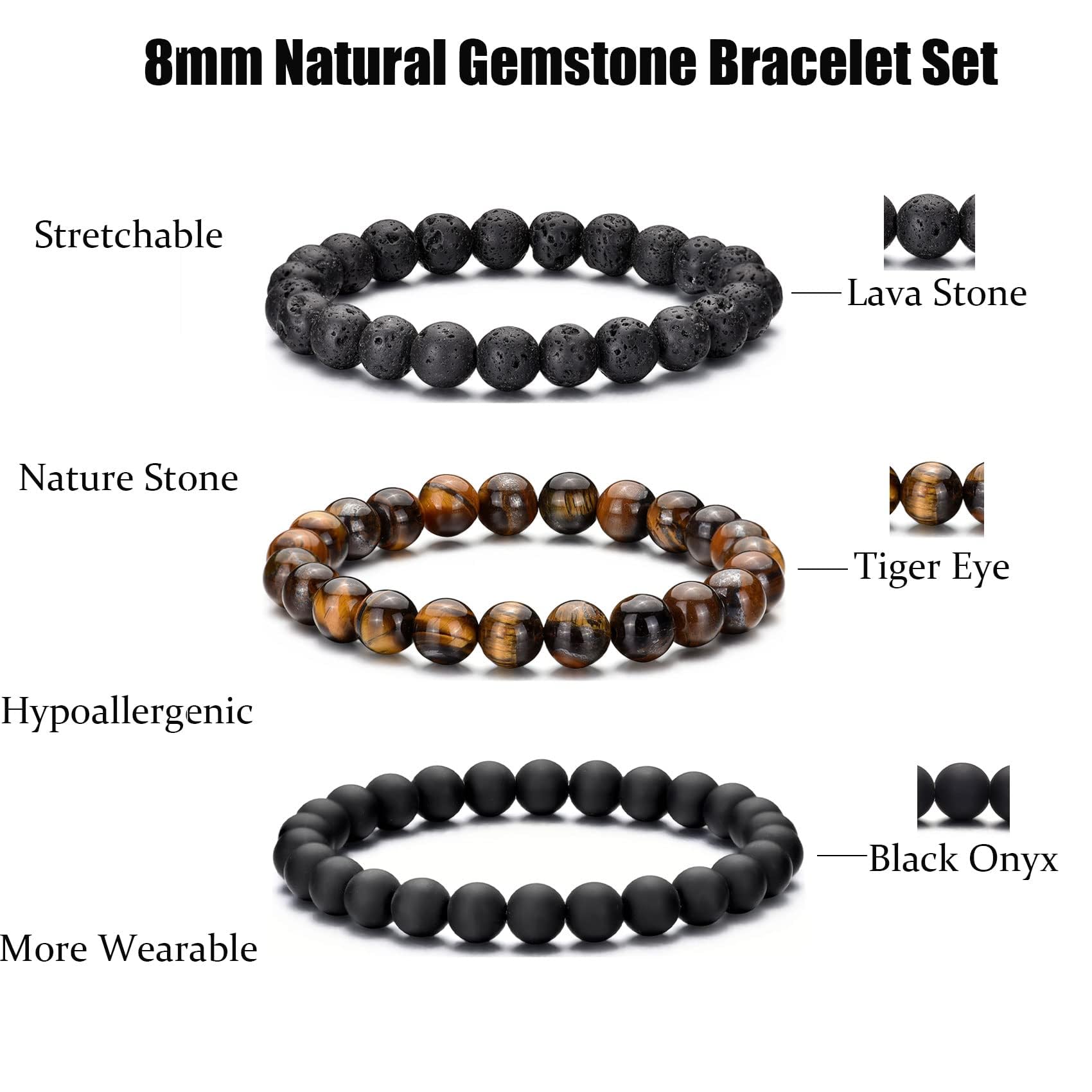 Mens Bracelets Size:The tiger eye stone and black matte agate stone bracelet can Stretch,Bead size:8mm,Adjustable Range: 7.3''-10.4''. Perfect sizes as gemstone bracelet for both men and women UNISEX. Natural tiger eye mens bracelet is a perfect bracelet jewelry accessory for any occasion to change your style and mood.