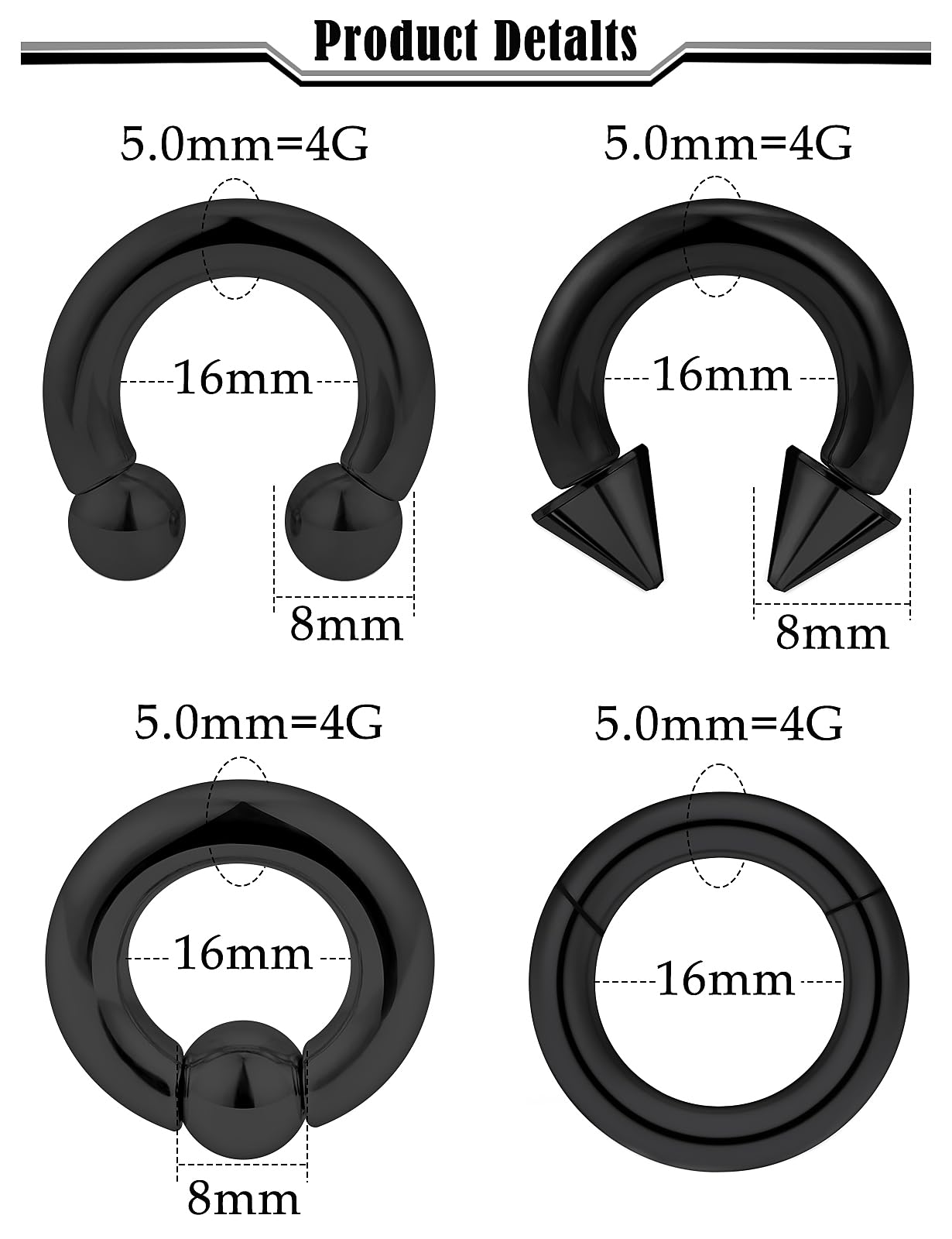 One Order Included 4 PCS Large Black Septum Rings Have 4 Styles, Each Style One Piece,Economical Price with Trendy Design Give You a Colorful Day.