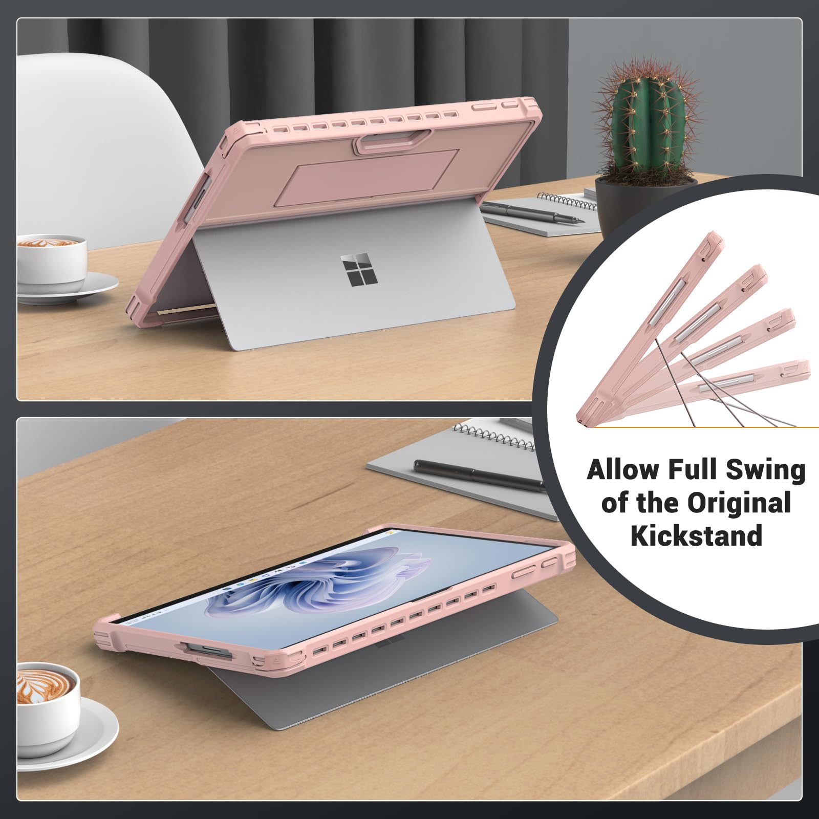 COMFORTABLE WORKING EXPERIENCE: With channel for directly connecting to Microsoft Surface Pro 11, Pro 10, Pro 9 type cover keyboard for an instant so that the user can use it without removing the case. The reserved back cutout allows the user to adjust Microsoft Surface Pro 11, Pro 10, Pro 9 tablet kickstand freely to find the best viewing angle, writing angle or typing angle.