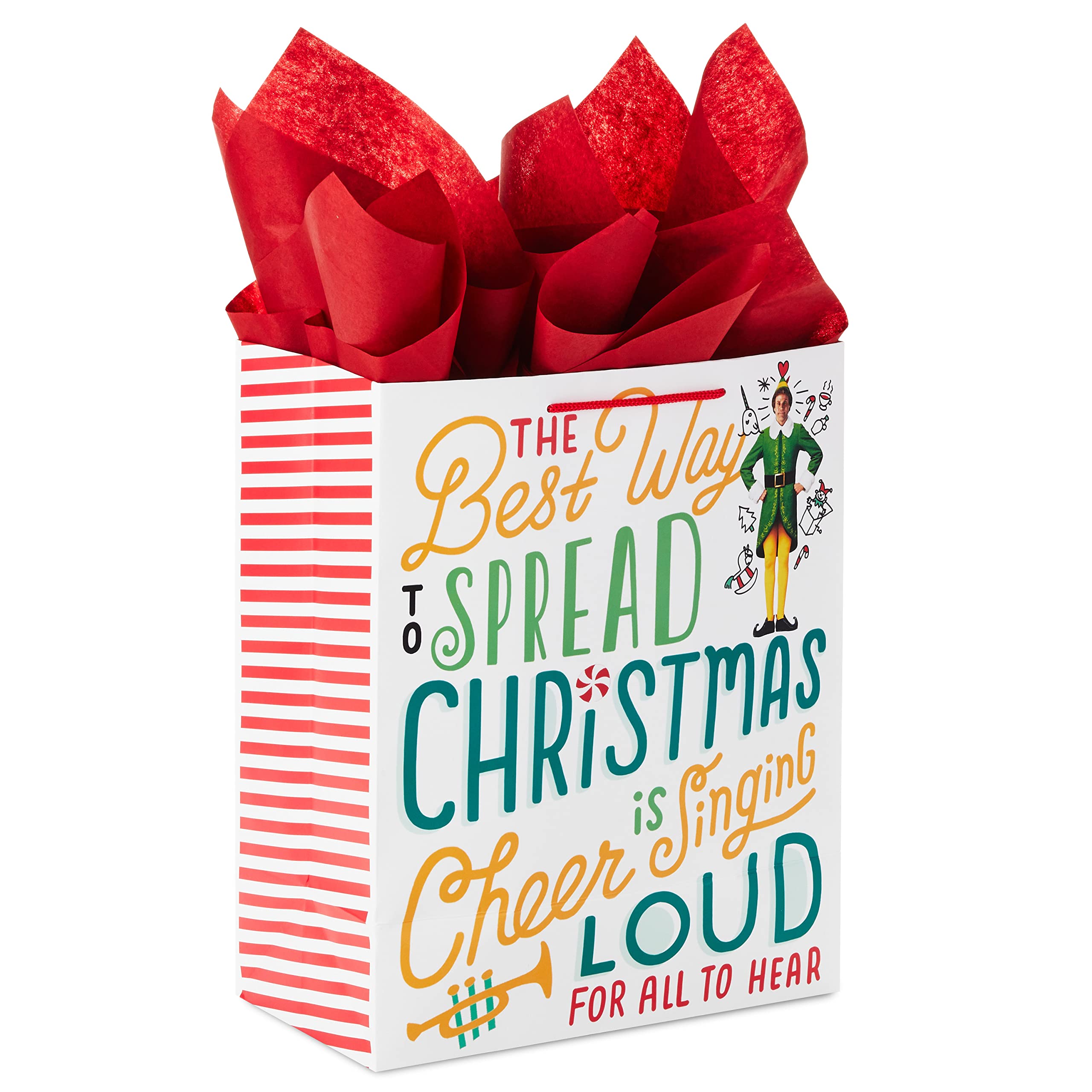 Joy to your world. Add a little magic to your holiday memories with a fun Elf gift bag with tissue paper. Cute Christmas gift bag with handles features a famous quote from the classic holiday movie "Elf" in colorful lettering: "The best way to spread Christmas cheer is singing loud for all to hear." Purchase includes 3 sheets of red tissue paper to make wrapping presents quick and easy. The Hallmark brand is widely recognized as the very best for greeting cards, gift wrap, and more. For more than 100 years, Hallmark has been helping its customers make everyday moments more beautiful and celebrations more joyful.