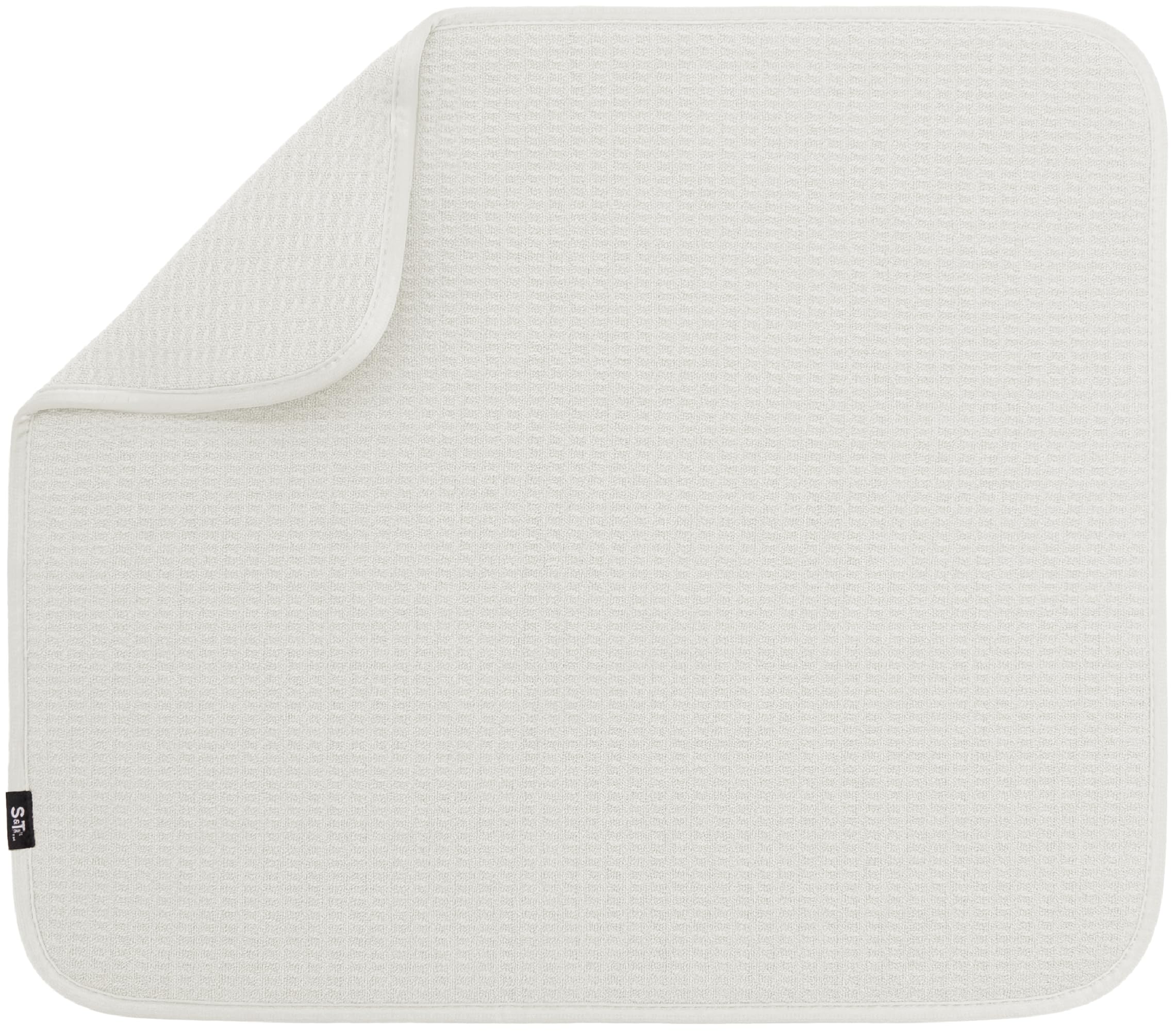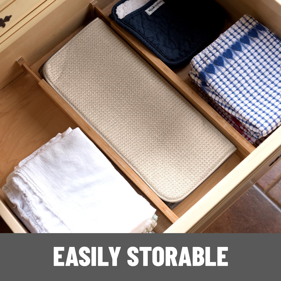 QUICK-DRY HANG TAG | EASY STORAGE: Our manufacturing process creates naturally strong and durable dish-drying mats . Fold up and toss in a drawer or tuck it elsewhere when not in use , and simply hang with the reinforced tag to dry . Our flexible core , folded between high-tech layers of microfiber , the ideal dish dryer mats .