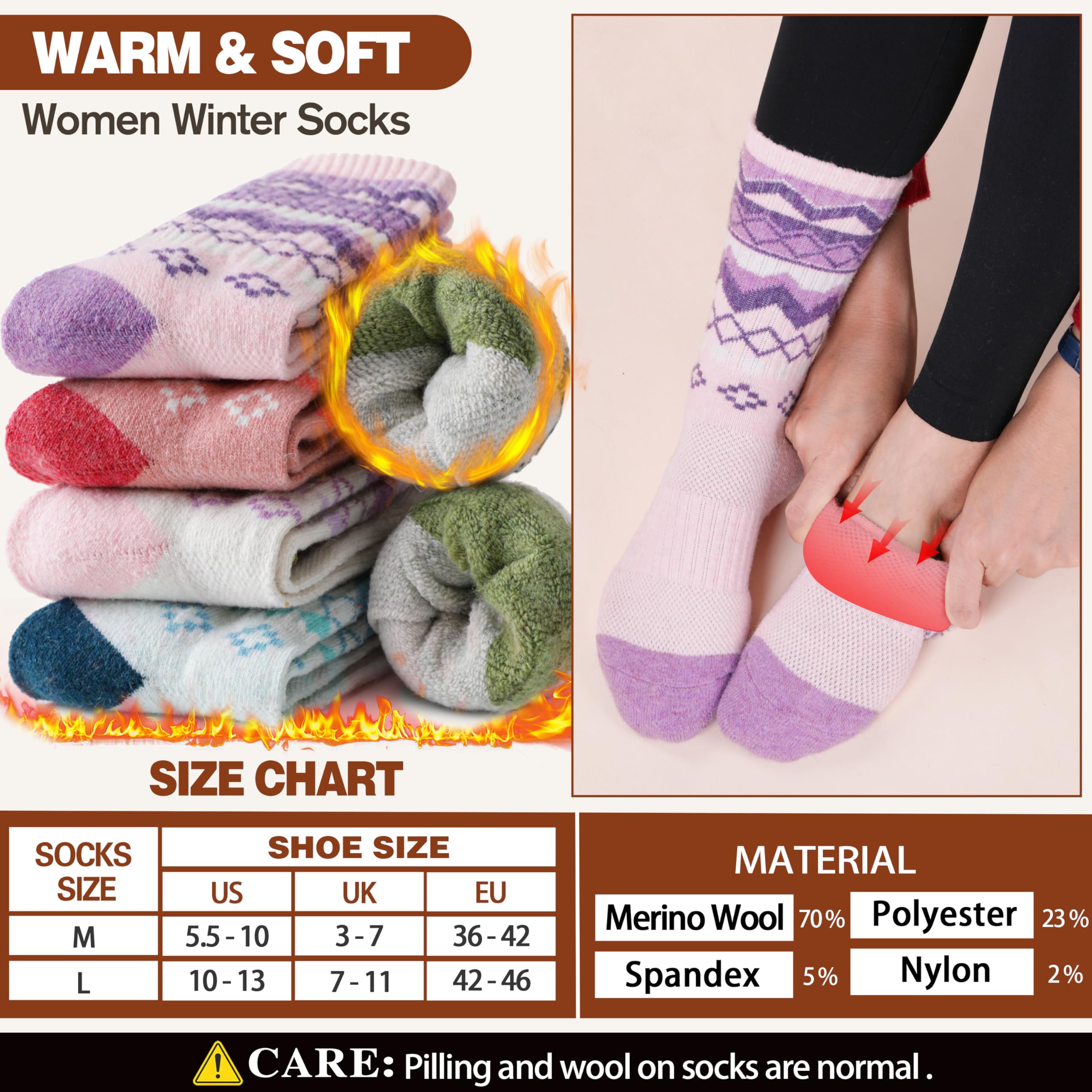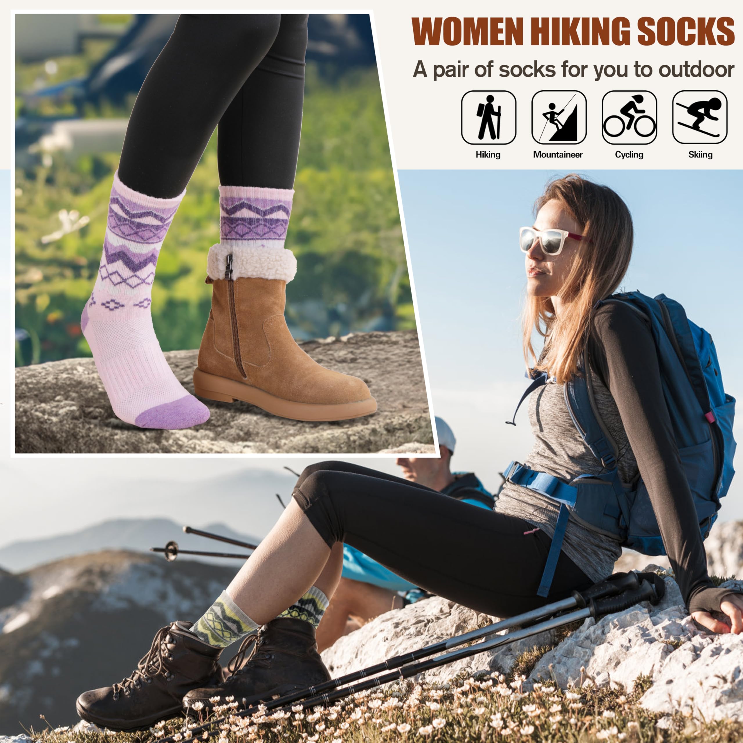 SELECTED MATERIAL - These womens hiking crew socks made of 70% MERINO WOOL, 23% polyester, 5% spandex , 2% nylon.They can keep the temperature and warm up your feet in cold weather.