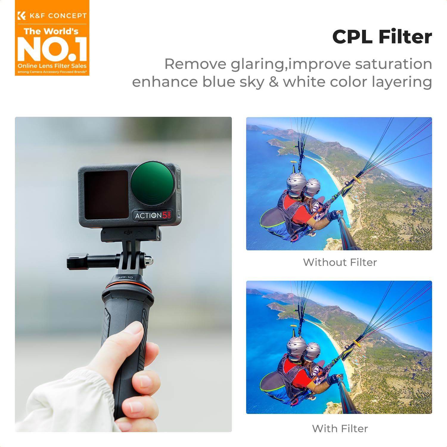 Reduce Glare & Enhance Contrast: The K&F CONCEPT CPL filter is an idea photography tool for fishing, skiing, architectural photography, and more. It helps capture more of the useful dynamic range and details with the feature of eliminating non-metallic surface reflections such as water and glass, and enhances the color and contrast, creating deep, rich scenic images