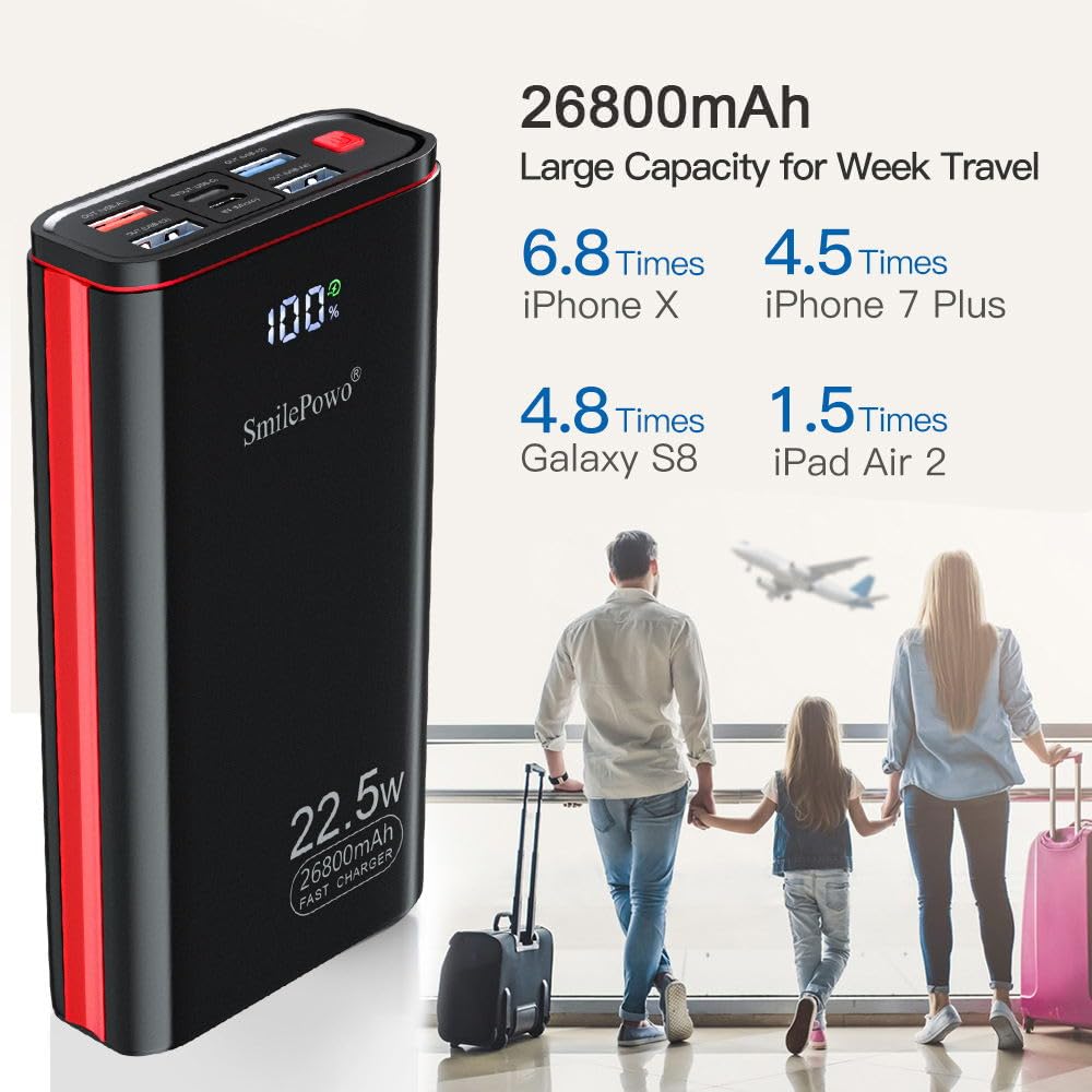 【26800mAh Durable High Capacity & Universal Compatibility】: Slim backup power charger battery for cell phone with higher capacity can recharge your iPhone X 6.8 times, Samsung Galaxy S8 4.8 times, iPhone 7 Plus 4.5 times, iPad Air 2 1.5 times. The battery bank compatibles with almost all the 5V devices as iPhone, iPad, Samsung, Sony, Huawei, HTC, LG, Nexus, Tablet, camera, Bluetooth, GPS and more smartphones.
