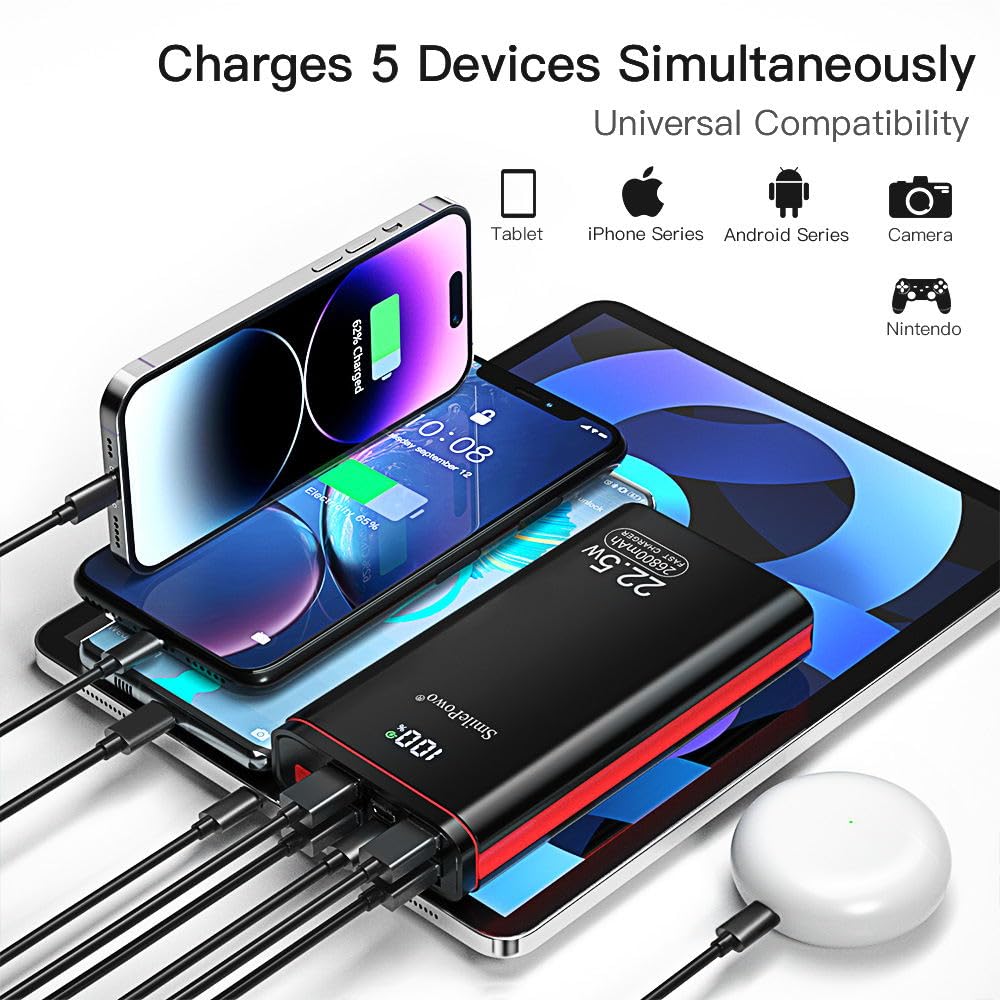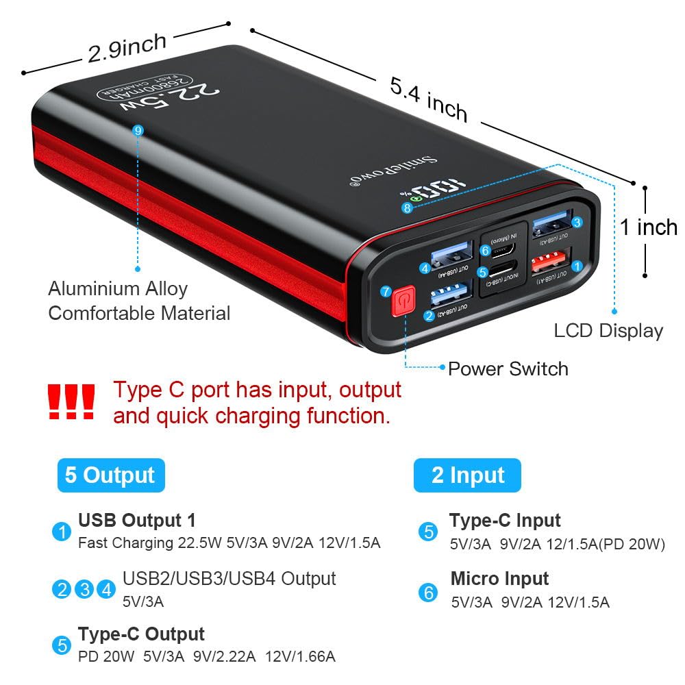 【Charges 5 Devices Simultaneously & Support Type C/Micro USB Input】: Simultaneous charging of multiple devicesThe portable power bank has 4 x 22.5W USB-A outputs and 1x 20W TYPE-C output, Can charge 5 devices simultaneously. Share the power with your friends and enjoy the fun. Moreover, the power bank fast charger supplies type-C and Micro input ports, can meet your different requirements when in charge. The charging time is much faster around 5-6 hours with 3A input port.