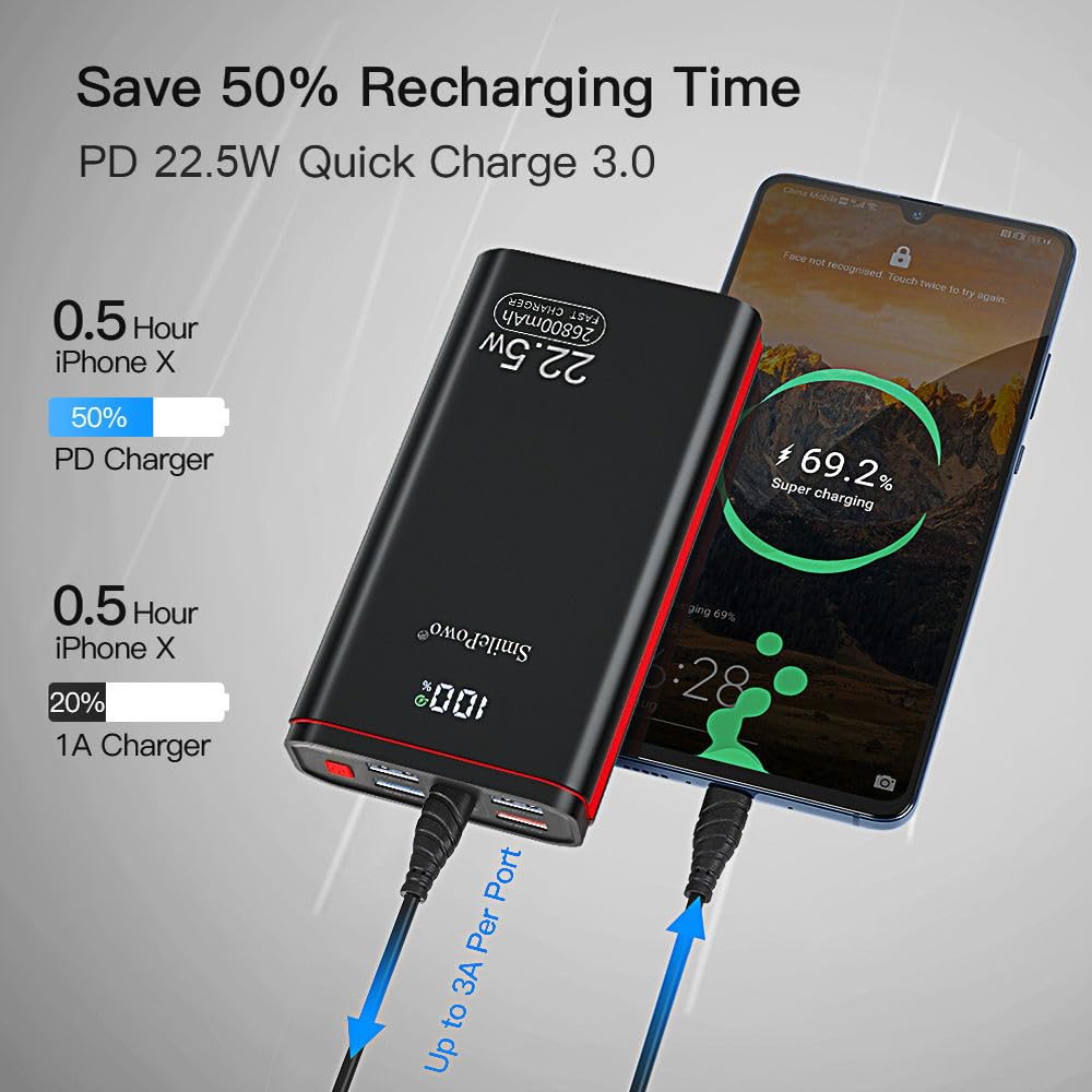 【What You Get】: 1 x SmilePowo PD 22.5W QC 3.0 26800mAh Quick Charge Portable Power Charger, 1 x Micro USB Charging Cables, 1 x User Guide.