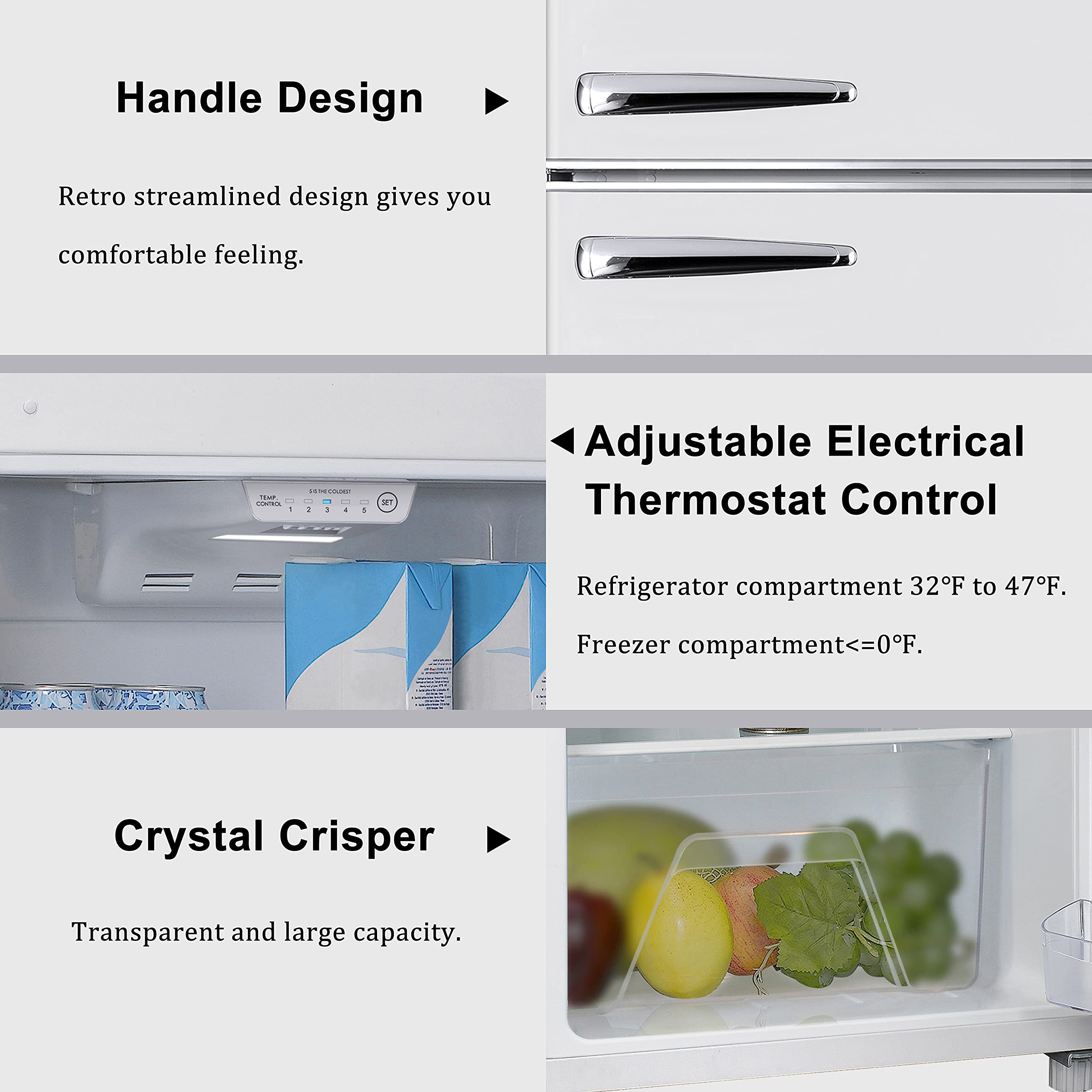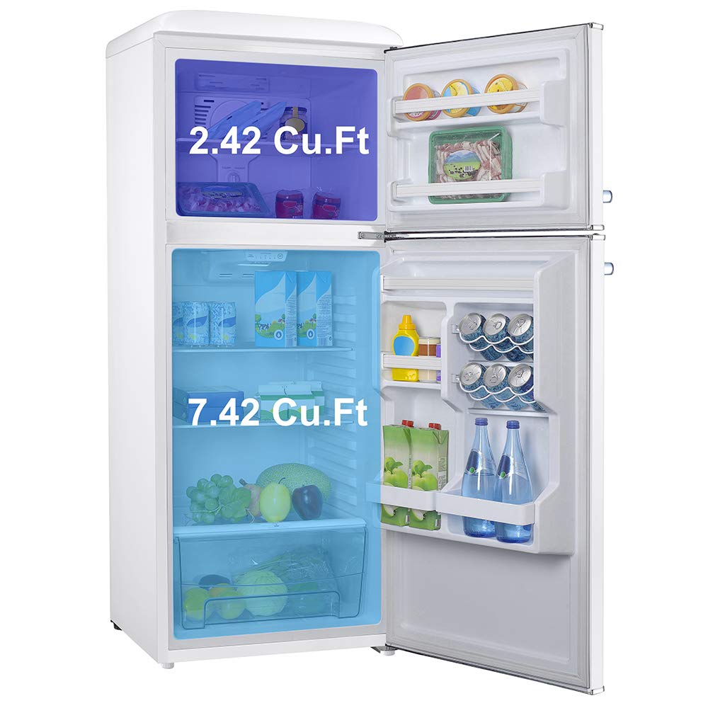 Product Features Retro Style Frost Free/ Adjustable Electrical Thermostat Control 1 Crystal Crisper 1 Crisper Glass Cover 3 Full Slide Out Glass Shelves Top Mount Freezer Compartment 2 Gallon Bottle Door Storage 6 Cans Dispenser Interior Light 2 Leveling Front Legs Specifications Capacity: 10.0 Cu.Ft Fresh food capacity: 7.42 Cu.Ft Freezer capacity: 2.42 Cu.Ft Voltage: 120Volts /60Hz Annual Energy Consumption: 292 kwh Installation Type: Free Standing